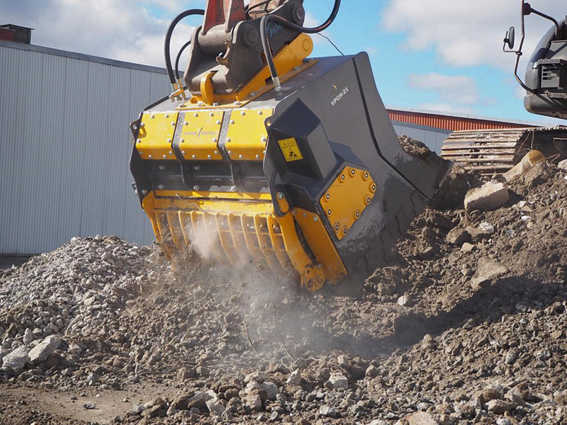 Alle Viper-Trommelbrecherlöffel können harte Materialien wie Beton und Fliesen zerkleinern. Häufig verursachen jedoch weiche, elastische und feine Materialien Kapazitätsprobleme beim Einsatz herkömmlicher Brecher. Der Viper-Trommelbrecher will sich hingegen auch bei gemischten Materialien effektiv zeigen – Asphalt, feine Materialien, Holz und gemischte Abfälle bringen nach Herstellerangaben keinerlei Kapazitätsprobleme mit sich. t