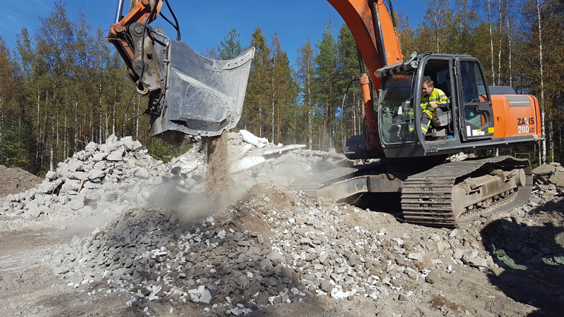 »Anstelle traditioneller Backenbrecher haben wir zum Zerkleinern der Betonblöcke auf langsam laufende Viper-Trommelbrechlöffel gesetzt. Wir haben zwar Erfahrung mit Backenbrechern, haben uns aber aus mehreren Gründen für den Viper-Brecherlöffel VPCH 21 entschieden – seine hervorragende Kapazität und die Vermeidung täglicher Wartungen haben uns sehr geholfen, den engen Zeitplan einzuhalten«, berichtete Tatu Kantola, Fahrer des Baggers mit dem Viper-Brecherlöffel.