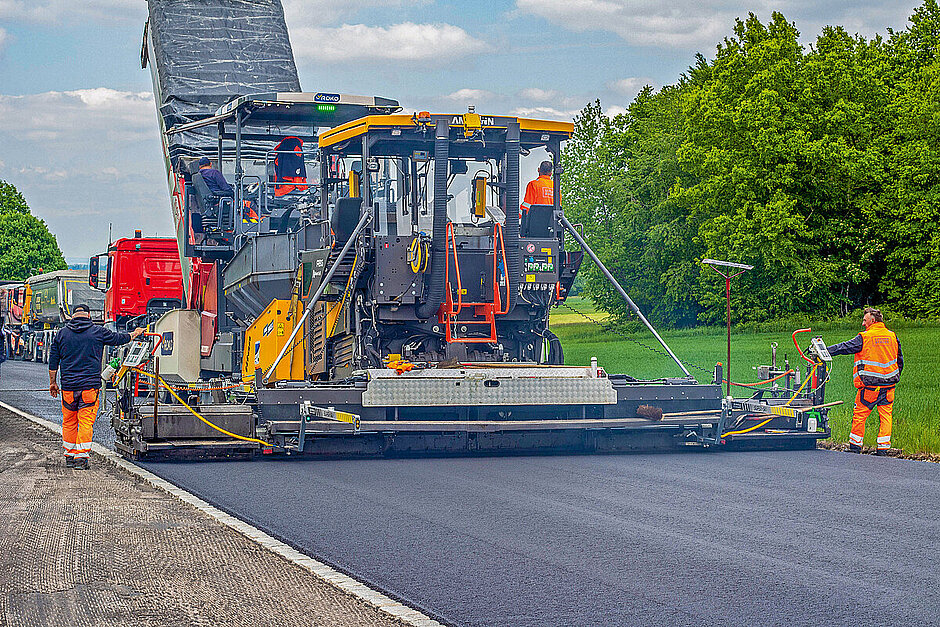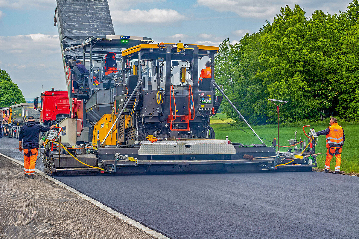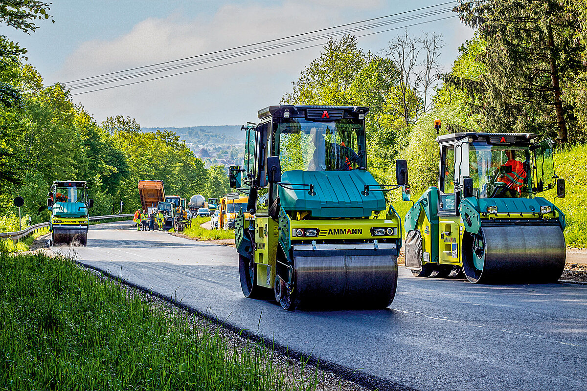 Knapp 4,5 km Bundesstraße, 8,5 m breit, sollten saniert werden. 38 000 m² Asphaltfläche mussten dafür ausgetauscht werden. Die Ausschreibung legte auf niedrige Emissionen, geringen Energieverbrauch und verbesserte Bedingungen für das Einbau-Team Wert. Verlangt wurden darum der Einbau von Niedrigtemperaturasphalt und ein Fertiger mit Bitumendampfabsaugung. Außerdem sollte die Sanierung in bereits drei Wochen starten und innerhalb von zwei Wochen abgeschlossen sein. »Für dieses Projekt hat uns Aebi einen Ammann-›ABG 8820‹-Straßenfertiger mit der geforderten Bitumendampfabsaugung sowie drei Ammann-›ARP 75‹-Drehschemelwalzen und eine ›ARX 90 C‹-Kombiwalze empfohlen«, so der Bauleiter. »Die Außentemperaturen waren mit frühlingshaften 6 bis 15 °C teilweise noch im kritischen Bereich.« Idealerweise sollte Niedrigtemperaturasphalt bei über 10 °C Umgebungstemperatur eingebaut werden. »Wir mussten gewährleisten, dass der neue Belag nicht nur termingerecht, sondern auch qualitativ perfekt eingebaut wird.« Darum wurden die Straßenbaumaschinen von Ammann mit digitalen Assistenzsystemen zur Einbau-, Verdichtungs- und Dokumentationskontrolle ausgestattet.
