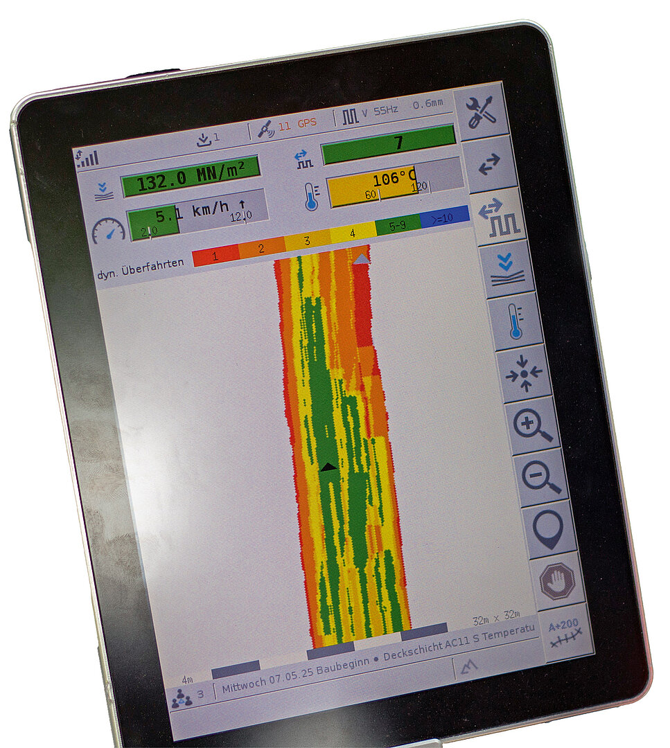 Volker Ernst, Leiter Road Machinery bei der Robert Aebi GmbH, setzte alle Hebel in Bewegung, um die Maschinen pünktlich zu liefern. »Den Ammann-Fertiger ›ABG 8820‹ hatten wir am Lager, er musste aber vor Auslieferung noch mit dem Moba-›Super-Ski‹ zur Nivellierung und dem Moba-Thermoscan zur Temperaturüberwachung ausgestattet werden.« Insbesondere die vier Ammann-Asphaltwalzen waren eine sehr spezielle logistische Herausforderung. Trotz der Mai-Feiertage musste Ammann Tschechien diese Maschinen rechtzeitig an Ammann Deutschland liefern. Dort wurden sie mit »QMachines«, der GPS gestützten Verdichtungskontrolle von QPoint, ausgerüstet, damit Xaver Lutzenberger die flächendeckende Verdichtungskontrolle (FDVK) nutzen konnte. Und anschließend musste alles zu Aebi geliefert werden, damit das Team die Maschinen letztendlich pünktlich auf die Baustelle auf der B16 liefern konnte.
