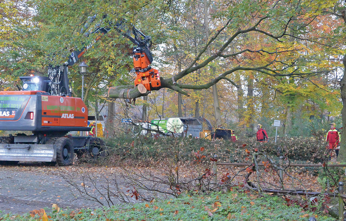Baumpflege, Fällung, Gutachten, Behandlung und Bekämpfung von Baumkrankheiten sowie Baumschädlingen sind die Arbeitsfelder der Baumpflegezentrale aus Greven. »Wir fällen keine Bäume ohne vorherige Prüfung auf Artenschutz. Wir achten auf Tiere wie Eichhörnchen, Fledermäuse, Vogelbrut und anderes«, sagt Björn Dewitt, Geschäftsführer der Baumpflegezentrale. Neben den genannten Arbeiten bietet man auch Helikopterfällungen an. »Herkömmliche Fällungen sind nicht immer möglich. In manchen Fällen müssen tonnenschwere Ast- und Stammteile im Minutentakt ohne direkten Zugang zu einer Straße transportiert, zerkleinert und verladen werden. Dann ist eine Helikopterfällung oft die einzige Möglichkeit, einen Baum sicher und effizient abzutragen«, so Dewitt. Auf der Erde wird oft mit dem Atlas-Mobilbagger 190W gearbeitet.