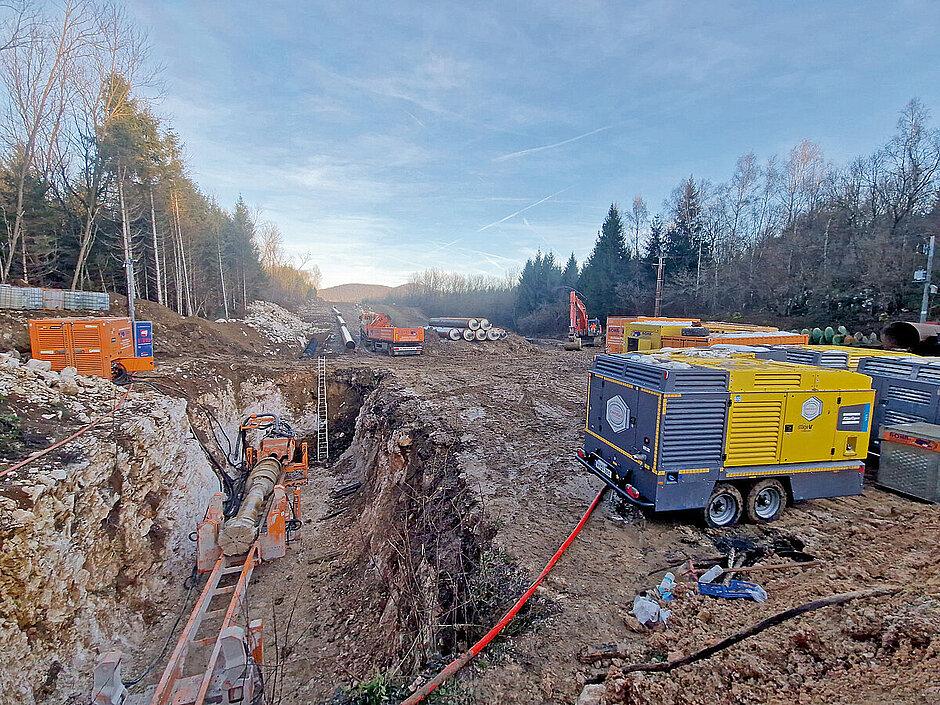 Um den hohen Luftbedarf von bis zu 150 m³/min bei 25 bar zu decken, kombinierte Petzold eigene Großkompressoren mit zusätzlichen Mietaggregaten. Zwei Schlüssel zum Erfolg: die enge Zusammenarbeit mit dem Vermietungspartner Kleinstück und die perfekte Abstimmung von Hydraulik, Hammerbohrer und Druckluftversorgung. »Technisch haben wir die beiden Baustellen in Kroatien beherrscht, aber an die Anblicke eines Braunbären neben der einen und eines Wolfs in der Nähe der zweiten Baustelle mussten wir uns erst mal gewöhnen«, grinst Mark Petzold. Er ist Polier im Unternehmen seines Vaters, der Rohrleitungsbau Andreas Petzold e. K. mit Sitz im sächsischen Elstra, nordöstlich von Dresden. Auf den beiden Baustellen, die Petzold im vergangenen Winter geleitet hat, mussten seine Teams unter schwierigen Bodenverhältnissen Bohrungen für Gasleitungen setzen – unterirdisch unter Autobahnkreuzungen. »Die erste Bohrung bei Lučice war gut 107 m lang und hatte einen Durchmesser von 1 m«, sagt Petzold. »Ursprünglich hatte dort eine einheimische Firma mit einer Maschine eine Bohrung für ein DN-1200-Stahlrohr begonnen.« Die sei mit ihrer amerikanischen Schneckenbohrmaschine aber stecken geblieben: »Der Bohrkopf hat sich verhakt und ist dann abgerissen«, weiß der Polier. »Denn der klüftige Untergrund wechselte ständig zwischen Fels, Lehm, Geröll und aufgeschüttetem Boden.« Sehr anspruchsvolle Voraussetzungen, die auf der Welt nur an wenigen Orten vorkommen und nur mit wenigen Bohrern sicher zu bewältigen sind.