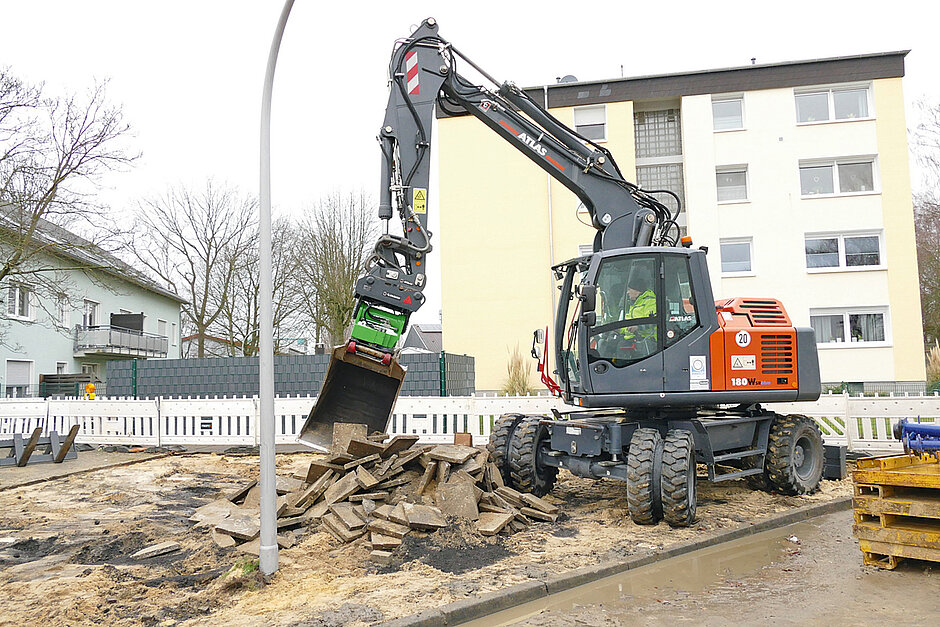 Mobilbagger und Anbaugerät im effizienten Zusammenspiel: Direkt vor Ort spielt diese Kombination eine hohe Flexibilität aus, was Zeit und zusätzlichen Aufwand spart.