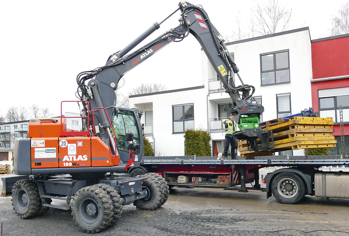 Als Inhaber einer Baufirma aus Waltrop setzt Stefan Gockeln auf den von Atlas konzipierten Mobilbagger 180 WSR: »Mit der Maschine haben wir auf räumlich engen Baustellen viele Probleme erst gar nicht. Durch Kurzheck, Tiltrotator und hydraulischem Schnellwechsler braucht er wenig Platz und kann unglaublich flexibel arbeiten.« Durch sein Kurzheck mit 1 950 mm Schwenkradius ist der Mobilbagger für räumlich enge Baustellen eine hilfreiche Lösung. Der 21 t schwere 180 WSR wird von einem 4.04 l Deutz-Motor mit 115 kW/156 PS angetrieben. Es ist ein Motor der Stufe V mit Abgasnachbehandlung durch Dieselpartikelfilter und passiver kontinuierlicher Regeneration. Und er ist nach Angaben des Herstellers wirklich leise und soll »keine Unterhaltung, die geführt wird stören«. Die Schallwerte mit 70 dBA in der Fahrerkabine und 97 dBA im Außenpegel sprechen dafür.