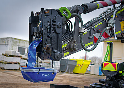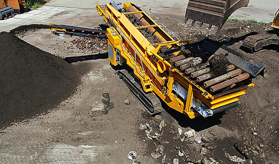 Das Sternsieb ist in der Neigung einstellbar. So ist die Siebintensität in einer Bandbreite regelbar und die Maschine kann in hügeligem Gelände arbeiten. Das Sternsieb 2-ta verfügt neben Grizzlyscreen über ein, bei 45 mm arbeitendes, Sternsieb. Es befindet sich nach Anbieterangaben derzeit in Kombination mit 10 mm Beistellsieb, Windsichtung und Magnet für die Reinigung von mineralischem Bauschutt im Test. Die komplette Anlage wird in dieser Betriebssituation per Sternsieb 2-ta angetrieben. §