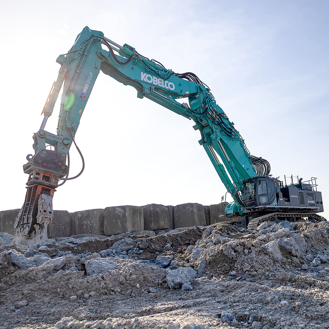 Reach-Auslegerkombinationen bietet Kobelco für sein Spitzenmodell – entsprechend spezifisch lässt sich die Maschine anpassen. Sind die oberen Etagen abgeräumt, wechselt der Kobelco »SK1300DLC« in etwa zwei Stunden die Arbeitsausrüstung am Grundausleger: Werkzeuge bis knapp 10 t ermöglichen dann den »kurzen Prozess« in gut 24 m Höhe – vom Boden aus lassen sich je nach Anbau-Werkzeug (max. 12 t) Fundamente bis rund 10 m Tiefe effizient zurückbauen. Als komplett neue Maschine kündigt Kobelco im Rahmen der neuen 11er-Generation seiner »DLC«-Baureihe aktuell den Kobelco »SK650DLC« an: Innerhalb der eigenen Baureihe knapp über dem bestehenden »SK550DLC« angesiedelt, bietet der 80-t-Bagger mit »Next«-Wechselausrüstung neben einer neuen Abbruchkabine deutlich höhere Anbaugewichte für Abbruchwerkzeuge (3,7 t bei 28 m/6,1 t bei 17,6 m), die sich aufgrund einer neuen Geometrie der High-Reach-Ausrüstung nun auch in Bodennähe effizient einsetzen lassen