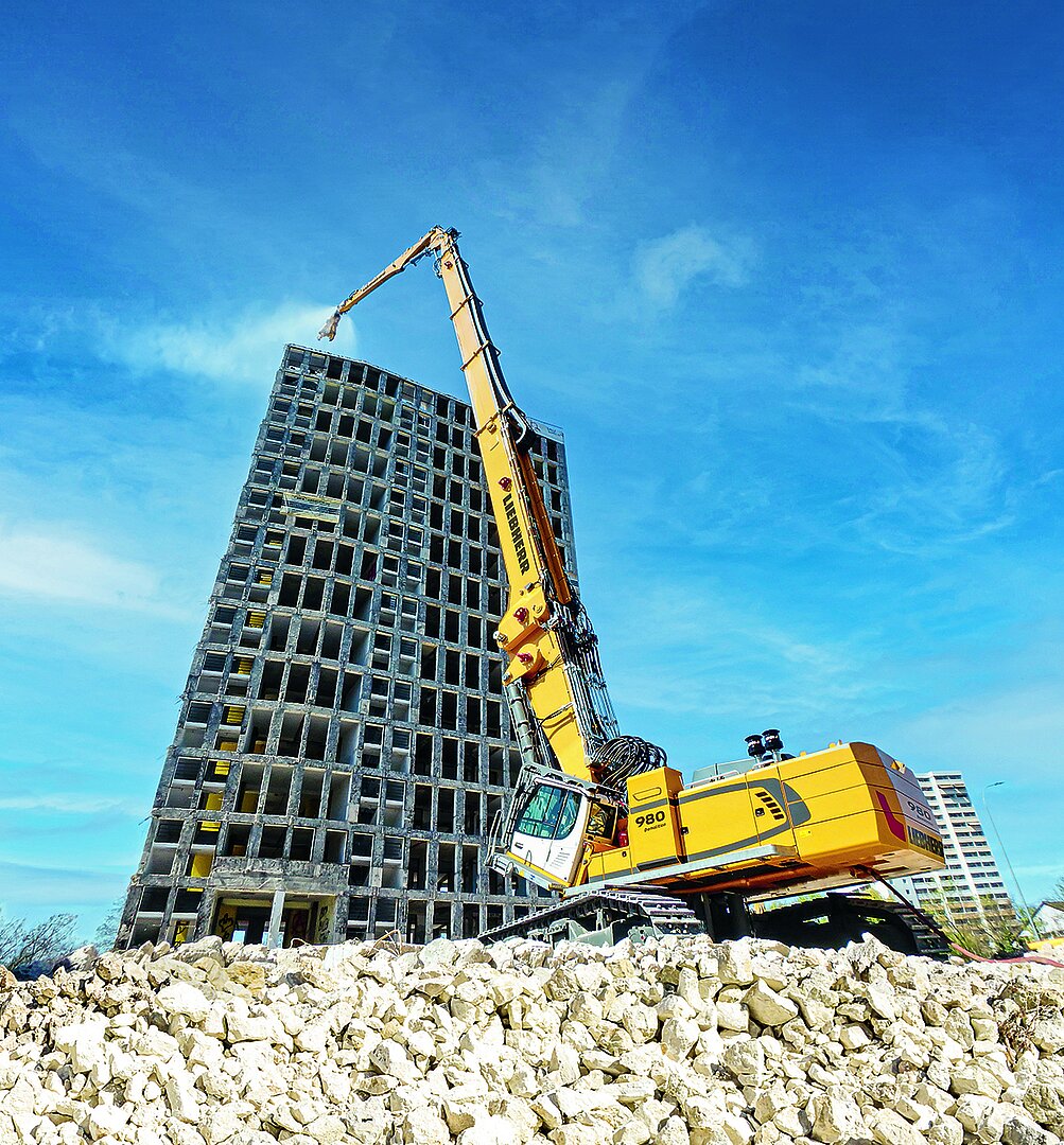 einer Höhe von 75 m eine massive Abbruchkugel zu betreiben. Stück für Stück schlug der Gigant die Gebäudestruktur in Stücke.