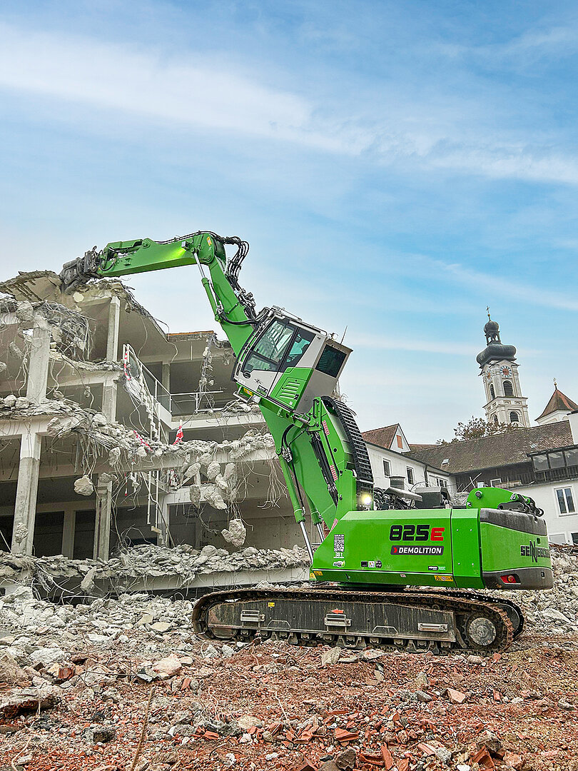 Ein Alleinstellungsmerkmal im Abbruchsegment bringt Sennebogen mit sich: Der Hersteller kann nicht nur reine Abbruchbagger, sondern eben auch spezialisierte Abbruchmaschinen aufbieten. Hochleistungsmaschinen wie der Abbruchbagger »870E Demolition« kommen auf ein Einsatzgewicht von bis zu 117 t bei einer erstaunlichen Reichweite von bis zu 36 m. Damit deckt die Maschine eine große Einsatzbandbreite ab. Entwickelt wurde der Longfront-Demolitionbagger für den Rückbau großer Industrieanlagen, Hallen und Gebäudestrukturen. Je nach Einsatz ist er mit Abbruchgreifer, Hammer oder Pulverisierer ausrüstbar. Angetrieben wird der »870E« von einem Dieselmotor mit 298 kW Leistung. Je nach Stockwerkhöhe können Gebäude mit einer Höhe von neun bis zehn Stockwerken abgebrochen werden. Und: Gerade in eng bebautem Gebiet kann die Maschine ihre Vorteile ausspielen – sie fasst punktgenau mit der Abbruchschere oder dem Greifer die Gebäudestrukturen und bringt die Teile sicher zu Boden. Eine Besonderheit stellt bei den Sennebogen-Abbruchbaggern außerdem die Kabine dar. Sie ist hochfahrbar und lässt sich gleichzeitig neigen, was dem Maschinisten einen guten Überblick auf das Abrissobjekt bietet. Verbaut sind in den Sennebogen-Baggern überdies starke Hydrauliksysteme inklusive eines dritten Hubzylinders für Anbaugeräte mit einem Gewicht von bis zu 4 t bei Reichhöhen von bis zu 36 m. Wie erwähnt, bietet Sennebogen allerdings auch hochinteressante Abbruchmaschinen auf: Mit Traglasten von 70 t beim »670E« bis 300 t beim »6300E« lassen sich die als Seilbagger konzipierten Maschinen beispielsweise mit einer Abrisskugel ausstatten. Üblicherweise werden diese Maschinen mit Anbaugeräten wie Schleppschaufeln, Verrohrungsmaschinen sowie Kranausrüstung oder Greifern versehen. Der wahrlich größte und schwerste unter ihnen ist der besagte »6300 E«, ein Koloss mit einer Hakenhöhe von bis zu 80 m, angetrieben von einem 840 kW starken Motor. Beim Abbruch eines hohen Gebäudes wurde der Seilbagger beispielsweise verwendet, um in