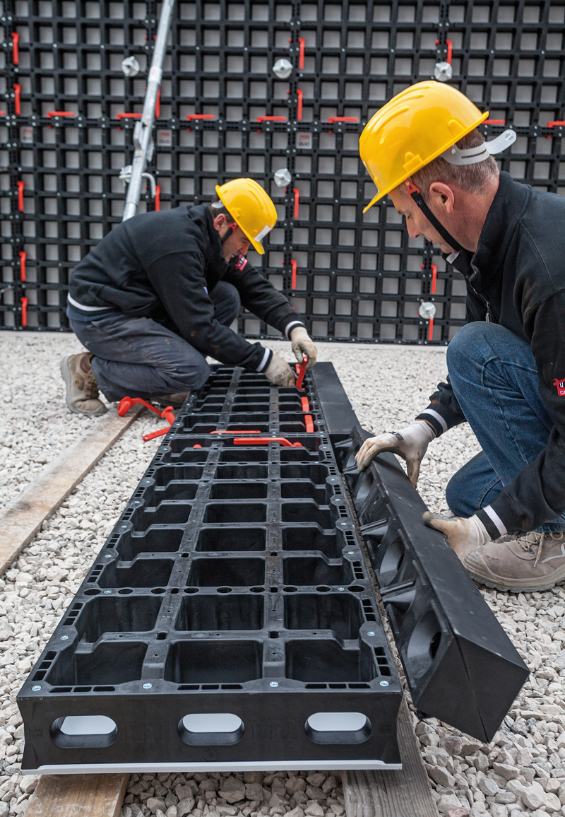 Überdies will das System mit Robustheit sowie hohen Werten hinsichtlich Festigkeit, Steifigkeit und Tragfähigkeit überzeugen. Als Alternative zu Bauteilen aus Holz und Stahl punktet das Material bei Feuchtigkeitsproblemen wie Schwinden, Quellen oder Korrosion. Einsetzen lässt sich die Polymerschalung sowohl im Neubau als auch beim Bauen im Bestand. Ebenfalls eignet sich das System für den Garten- und Landschaftsbau: Es wird dort zum Beispiel bei Stütz- und Gartenmauern oder Schwimmteichen eingesetzt. t