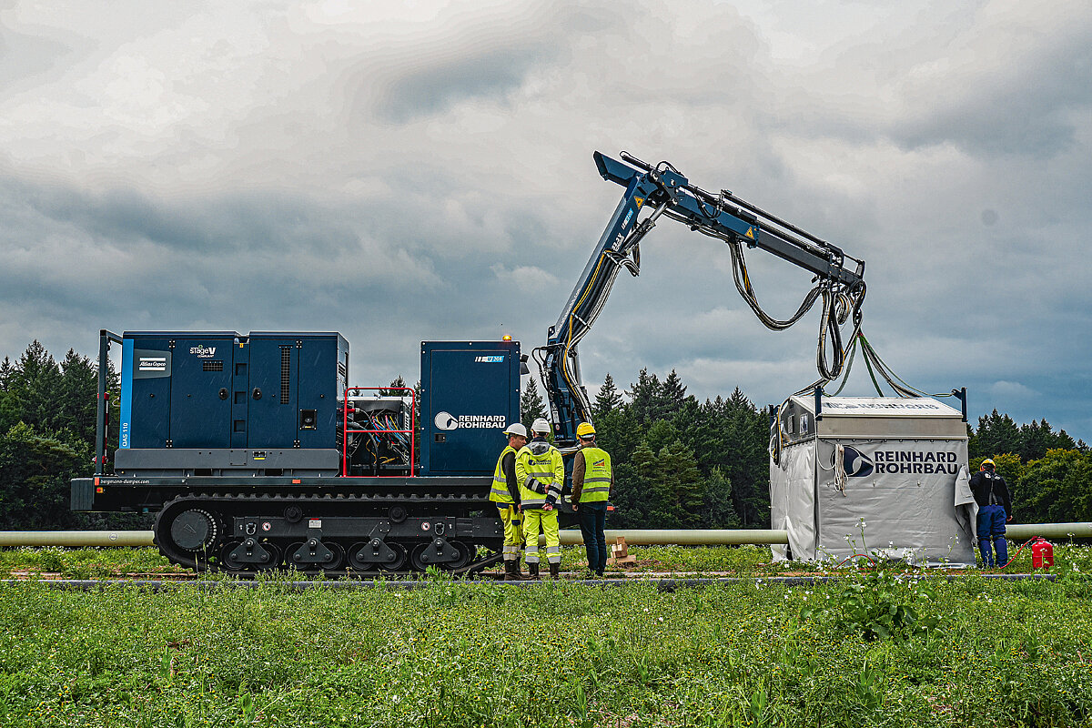 Ein Dieselgenerator liefert der Maschine die benötigte Energie, während der Antrieb bereits elektrisch unterstützt wird. Im Vergleich zu marktüblichen Schweißraupen wird so ein Antriebsmotor eingespart – das reduziert Wartungskosten, Kraftstoffverbrauch und Abgasemissionen. Gleichzeitig ist das Fahrzeug zukunftssicher konzipiert und kann künftig vollständig auf Batteriebetrieb, Gasmotoren oder beispielsweise Wasserstoff-Brennstoffzellen umgestellt werden. Dadurch eröffnet sich für Reinhard Rohrbau die Möglichkeit, künftig emissionsfrei zu arbeiten. Die Praxistauglichkeit zeigte sich bereits beim ersten Einsatz: Auf der Baustelle wird eine DN200-Rohrleitung verlegt. Mithilfe ihres integrierten Krans verlagert die Raupe das mobile Schweißzelt von einem Rohrabschnitt zum nächsten. An der jeweiligen Position erfolgt die Weiterführung der Rohrleitung, indem der nächste Abschnitt präzise positioniert und angeschweißt wird. Mit einer Auslage von 13,6 m und einer Hubkraft von 920 kg bei voller Reichweite erfüllt der Kran mühelos die Anforderungen des Pipelinebaus. Neben dem WIG-Schweißen kann die Hybrid-Schweißraupe bei Bedarf auch andere Schweißverfahren ausführen, wodurch sie flexibel auf unterschiedliche Baustellenaufgaben reagiert.