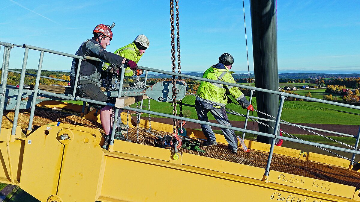 Nach der Montage wurde der Obendreher zunächst im Vier-Strang-Betrieb an den Kunden übergeben. So ist er für das Heben besonders schwerer Lasten prädestiniert. Sobald die Stahlbetonstützen verbaut sind, ist die Umstellung auf den Zwei-Strang-Betrieb geplant. Dann reichen 30 t im Maximalhub, und der Kran kann schneller arbeiten. Die Möglichkeit für beide Varianten ist eine Besonderheit des »630 EC-H 50«.j
