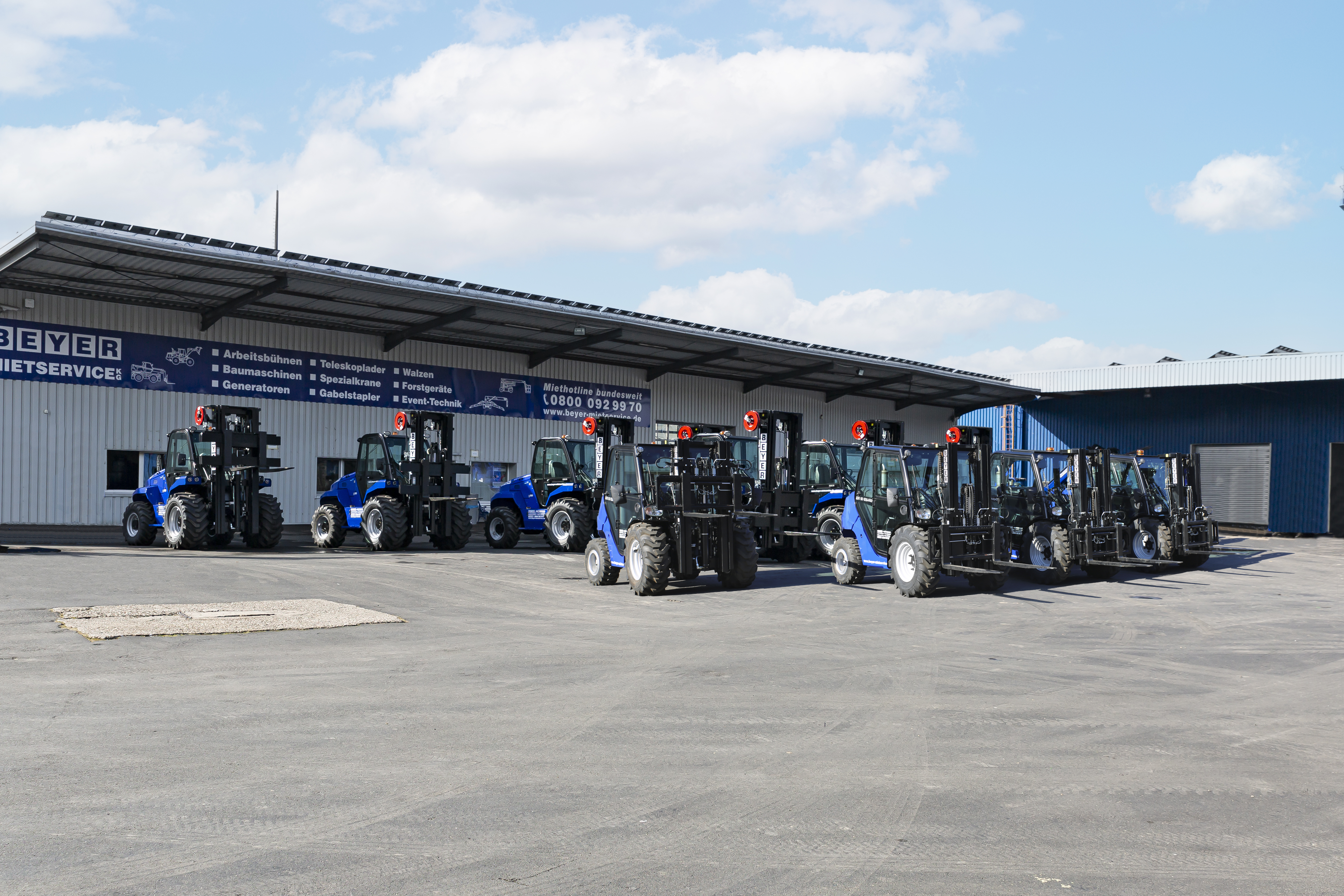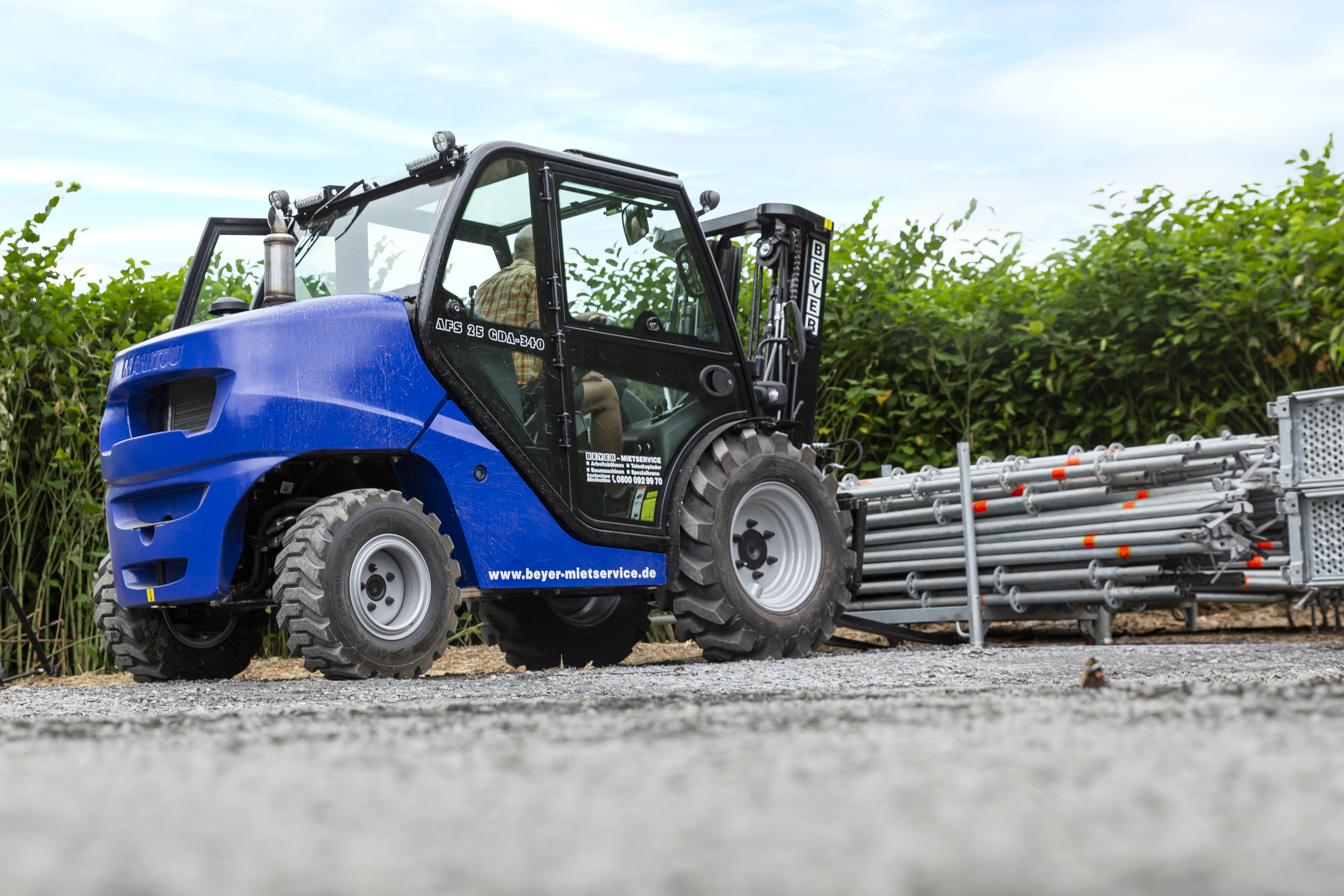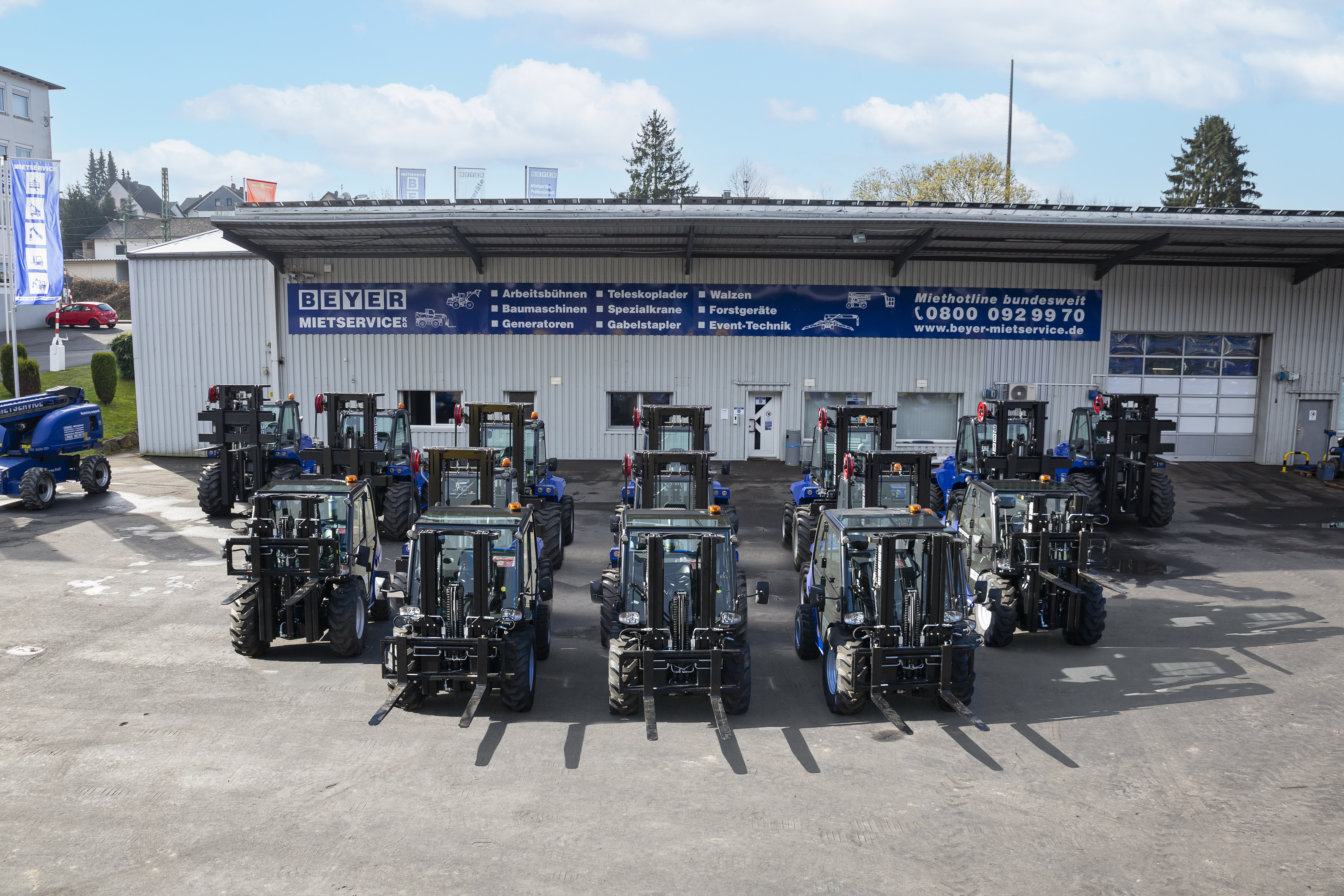 Mit dem 2,5-Tonner MC 25-4 D K STS S1 habe Beyer-Mietservice nunmehr einen Geländestapler in die Flotte geholt, der mit auffallender Kompaktheit punkten könne: Dank Buggy-Kabine und Freihub-Triplex-Mast komme der Stapler auf nicht mehr 2,00 m Durchfahrtshöhe – die Masthöhe beträgt 1,99 m. Breite und Länge bemessen sich auf 1,47 m und 4,24 m, woraus wiederum ein kleiner Wendekreis von 3,41 m resultiere. Diese Mietmaschine sei genau die Richtige für das effiziente Lastenhandling auf engstem Raum und in höhenlimitierten Bereichen wie Parkhäusern, Festzelten, Lagercontainern oder Kellern.