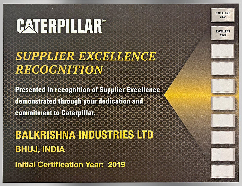 Die Excellent-Level-Zertifizierung ist die höchste Auszeichnung, die Caterpillar Inc. im Rahmen des SER-Prozesses an Lieferanten vergibt, welche die strengen Produktions- und Qualitätsanforderungen konsequent erfüllen. »Die erneute Auszeichnung durch Caterpillar mit der ›SER Excellence Level Certification‹ ist ein stolzer Moment, denn dies bestätigt die hervorragende Teamarbeit, die BKT während des gesamten Fertigungsprozesses verfolgt. Darüber hinaus ist diese Anerkennung ein weiterer Ansporn für uns, weiterhin neue und ambitionierte Ziele anzustreben, ohne dabei unsere Mission aus den Augen zu verlieren: den Bedarf der Industrie zu decken, indem wir immer leistungsfähigere und unverwechselbare Produkte anbieten, die Innovation und Sicherheit miteinander verbinden«, so Arvind Poddar, Vorsitzender und Geschäftsführer von BKT.