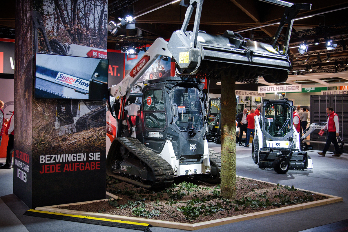 Besucher des Bobcat-Standes 332 in Halle 7 konnten Produkte aus dem Bobcat-Sortiment für die Landschaftsgestaltung und Grünflächenpflege begutachten. Dazu gehören Kompaktlader und Kompakt-Raupenlader, Minibagger, Teleskopen, Kompakt-Radlader, leichte Verdichtungsmaschinen, Generatoren und spezielle Anbaugeräte und Maschinen für die Forstwirtschaft.