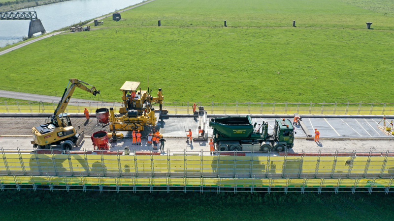 Implenia Schweiz gilt als führendes Bauunternehmen der Schweiz, arbeitet übergreifend in Deutschland, Österreich und anderen Ländern und beschäftigt europaweit mehr als 10 000 Mitarbeiter. Um in der Lage zu sein, Brückenprojekte mit UHFB erfolgreich auszuführen, benötigte Implenia eine mehrmonatige Testphase. Zunächst wurde der Baustoff entwickelt, dessen genaue Zusammensetzung geheim bleibt, dann eine spezielle Betonmischanlage. Ebenso wurde eine neue Bohle für den maschinellen Einbau mit dem Gleitschalungsfertiger GP 2400 von GOMACO entwickelt. Dieser kann Betondecken bis zu 7,32 m fertigen. »Der GP 2400 ist eine kompakte Maschine mit Möglichkeiten für verschiedene Bohleneinsätze sowie der Montage einer Heckbohle, die wir besonders in Tunneln für Betonfahrbahnen und Gleistragplatten einsetzen. Auch Gewicht und Kompatibilität passen zu unseren Anforderungen. Die Maschine ist flexibel und sehr geeignet für die Anwendungen bei den Projekten in der Schweiz«, betont Daniel Hardegger. Flexibel, weil Implenia mit nur drei verschiedenen Einbaubohlen eine große Anzahl möglicher Projekte abdeckt. Mit der extra entwickelten zero-clearance-Heckbohle hat Implenia erfolgreich ein großes Tunnelprojekt abgeschlossen. Die besondere Kombination aus Heckbohle und Fertiger ermöglichte es, dass Implenia 3,55 m breit fertigen konnte, ohne dass weiterer Platz am Rand benötigt wurde. Mit dem GOMACO-Fertiger und der UHFB-Bohle wurden insgesamt bereits 2 400 m³ UHFB auf Plätzen, in Wannen und Banketten, sowie in diversen Fertigteilen verbaut. Die Schichtdecken beliefen sich auf eine Höhe von 4 cm bis 12 cm.