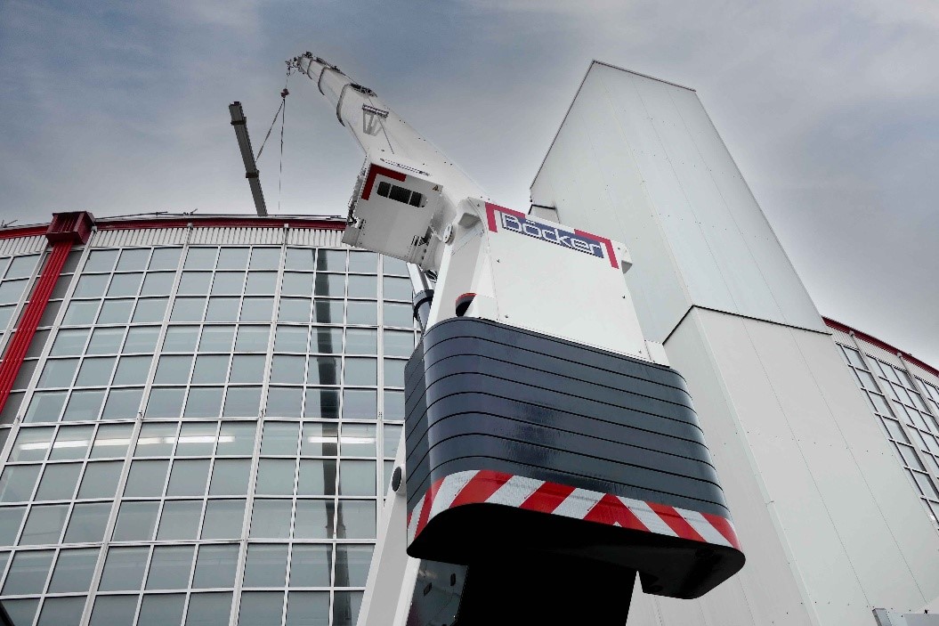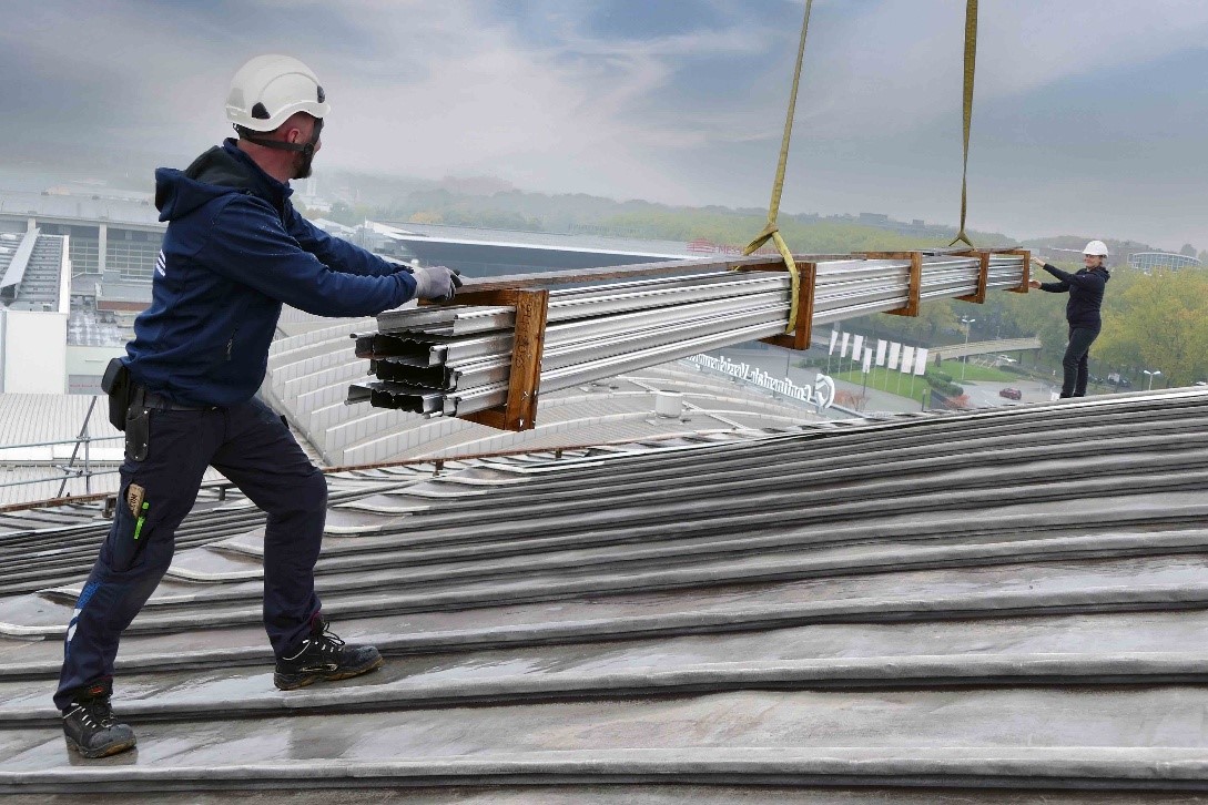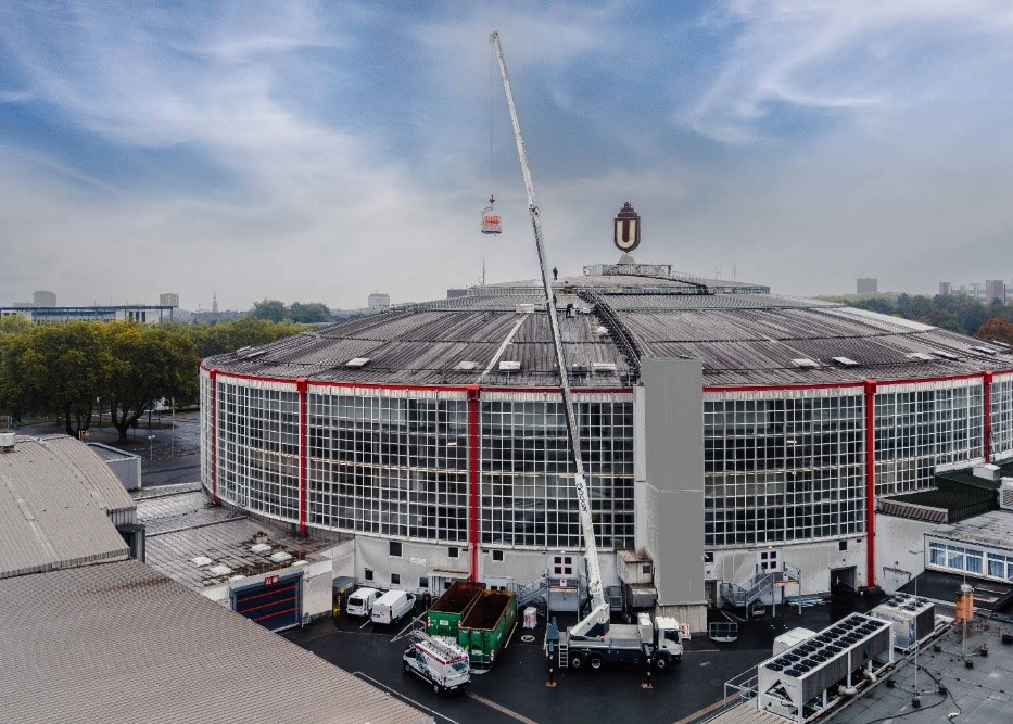 Die Westfalenhalle, bekannt für ihre markante Kuppelkonstruktion, wird derzeit abschnittsweise saniert. Bereits 2024 setzten Dirk Sindermann und sein Team eine Teilfläche instand, die bei einem Sturm an Heiligabend beschädigt worden war. In den kommenden Monaten steht nun die vollständige Erneuerung der Deckung des oberen Rings unterhalb der Kuppel an. Bedachungen Sindermann koordiniert die Arbeiten und nutzte die Gelegenheit, die neuen Böcker-Krane im Praxiseinsatz zu testen. Ein besonderes Augenmerk lag dabei auf der großen Reichweite, hohen Arbeitsgeschwindigkeit, intelligenten Steuerungstechnik und innovativen Mastgeometrie.