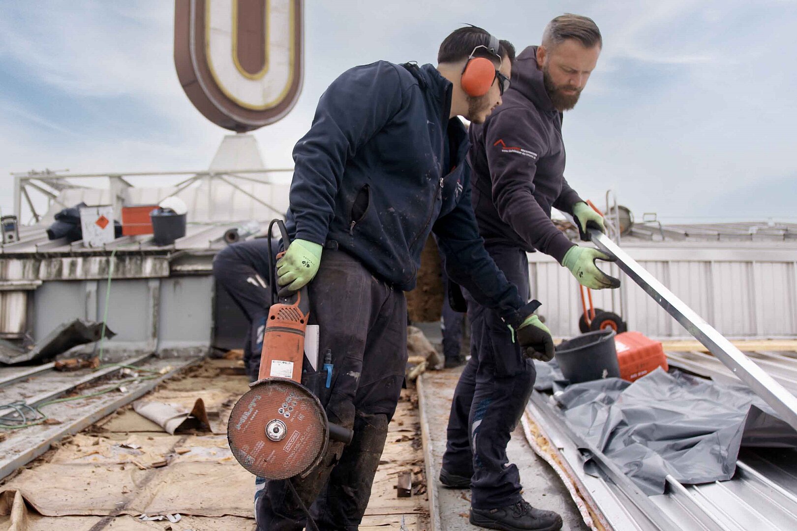Dank seiner geringen Aufstellfläche konnte der Autokran AK 48 direkt im beengten Betriebshof der Westfalenhalle positioniert werden. Mit einer Ausfahrlänge über 48 m (opt. 52), einer Nutzlast bis 3 t (opt. 6 t) und einer Hakengeschwindigkeit von 60 m/min bewältigte er souverän den effizienten Transport großer Materialmengen, die bei den Abrissarbeiten anfielen. Anschließend hob er Bitumenbahnen und Kalzip-Aluminiumprofile für die neue Deckung weit in die Höhe. Bei einer Dachkantenhöhe von rund 20 m bewies der Kran seine enorme Reichweite und hob die eingesetzte Kippmulde bzw. die angeschlagenen Profile weit auf das Dach hinaus. Eine Aufgabe, die bei Sindermann normalerweise der firmeneigene Böcker-Autokran AK 46 übernimmt, der die Materiallogistik auf den Baustellen des Betriebs seit fünf Jahren zuverlässig sicherstellt. Im Laufe der Sanierungsarbeiten an der Westfalenhalle werden in den nächsten Wochen so insgesamt 5 t Leistendeckung, etwa 28 t Steinwolle sowie die gesamte Holzunterkonstruktion effizient abtransportiert. Der neue Dachaufbau selbst besteht aus einer Sicherheitsabdichtung, Dampfsperre, mehrlagiger Wärmedämmung und der abschließenden Kalzip-Aluminiumdeckung. Alle Materialien finden dank Böcker Krantechnik kräfteschonend und in minimaler Zeit ihren Weg nach oben.