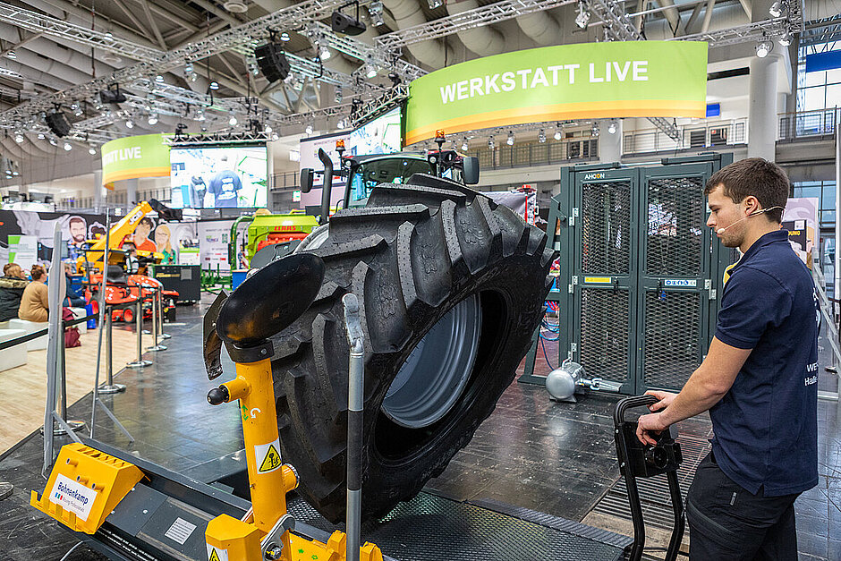 Am Stand F43 in Halle 2 zeigte Bohnenkamp die elektrohydraulische Reifenmontiermaschine SICE S 560, die speziell für die Anforderungen in Land- und Forstwirtschaft entwickelt wurde. Aktive und ehemalige Auszubildende führten die fachgerechte Montage großer Agrarreifen live vor. Unterstützt wurden sie von den Bohnenkamp-Experten Dennis Kaden und Dirk Lewandowski, die für Fragen rund um Technik und Beruf zur Verfügung standen.
