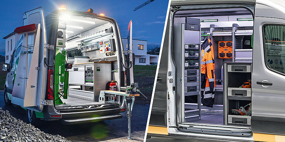 Die Fahrzeugeinrichtung des in Karlsruhe zu sehenden Mercedes-Benz-Sprinter soll Übersicht im Laderaum schaffen und so schnelles und hochwertiges Arbeiten fördern. Werkzeuge und Kleinteile lassen sich wohlsortiert unter anderem in bottBox-Sichtlagerkästen, unterteilten Schubladen und Systainer³-Koffern aufbewahren. Große Bauteile und Geräte können mittels diverser Ladungssicherungspunkte im Laderaum verzurrt werden. Hierbei bietet sich der Einsatz von Spannstangen an, die dazu beitragen, auch sperrige Güter während der Fahrt an Ort und Stelle zu halten. Gerade auf der Baustelle ist das häufig der Fall: Die sperrige und zuweilen schwierig zu sichernde Ladung muss dennoch von A nach B gelangen, ohne dabei zur Gefahr zu werden. Ebenfalls ein wichtiges Thema: Um die Nachbearbeitung von Bauteilen im Einsatz zu ermöglichen, ist das Fahrzeug auch als mobile Werkstatt eingerichtet, was sich in Werkbänken mit Schraubstock, einer 230-V-Stromversorgung und umfassender Innen- und Außenbeleuchtung zeigt. Auf diese Weise ist der Anwender hochflexibel und kann schnell und unkompliziert reagieren.