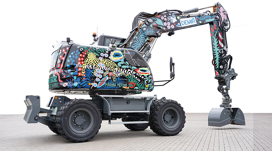 Ein Leopard auf der einen Seite, ein Chamäleon auf der anderen, eine Schlange, die das Heck ziert, bunte Blüten und Blätter so weit das Auge reicht: Illustratorin Marina Merino hat den Bagger in nur zwei Wochen mit Pinsel, Schleifpapier und Zwei-Komponenten-Lack zu einem echten Kunstwerk verwandelt. Doch warum dieser Aufwand? Mit dem Projekt »Bauen ist Kunst« will die Demir Unternehmensgruppe zu einem neuen Blick auf Baustellen einladen. »Aufgrund der unvermeidlichen Beeinträchtigungen, die durch unsere Großbaustellen entstehen, möchten wir mit optischen Anreizen eine gewisse Ablenkung schaffen. Um dem Stadtbild etwas zurückzugeben, hatten wir die Idee, eine unserer Baumaschinen bunt zu gestalten«, sagt Geschäftsführer Hakan Demir. Zugleich erhofft er sich einen besseren Zugang zu potenziellen Bewerbern. »Als lockeres und innovatives Unternehmen möchten wir den Bagger nach außen zeigen. Kunst findet sich oft nur im Museum wieder.