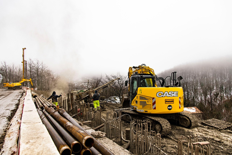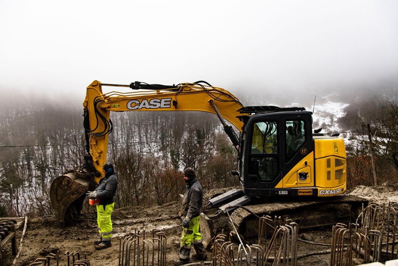 Als es darum ging, einen neuen Raupenbagger für einen von der Gemeinde Urbino beauftragten Aufräumeinsatz zu kaufen, folgte das Unternehmen dem Rat von MAIE und sah sich gemeinsam mit ihnen eine CASE Maschine an, die von der Feuerwehr in den vom Erdbeben betroffenen Gebieten der Region Marken eingesetzt wurde. Der Bagger wurde so angepasst, dass er dank eines Grabenlöffels und anderer technischer Vorrichtungen in unebenem Gelände optimal arbeiten kann. Zu diesem Zweck setzte sich Pretelli mit den Technikern von MAIE unter der Leitung von Marino Venturini zusammen und veranlasste einige Modifikationen an dem CASE Bagger CX210D. Dabei entstand ein einzigartiges Modell mit zusätzlicher Schaufel und Ausleger für Abbruch- und Aushubarbeiten, mit ausgezeichneter Stabilität und Sicherheit. Die Maschine hat sich immer wieder bewährt, sogar bei Arbeiten in den Höhenlagen der Bocca Trabaria.