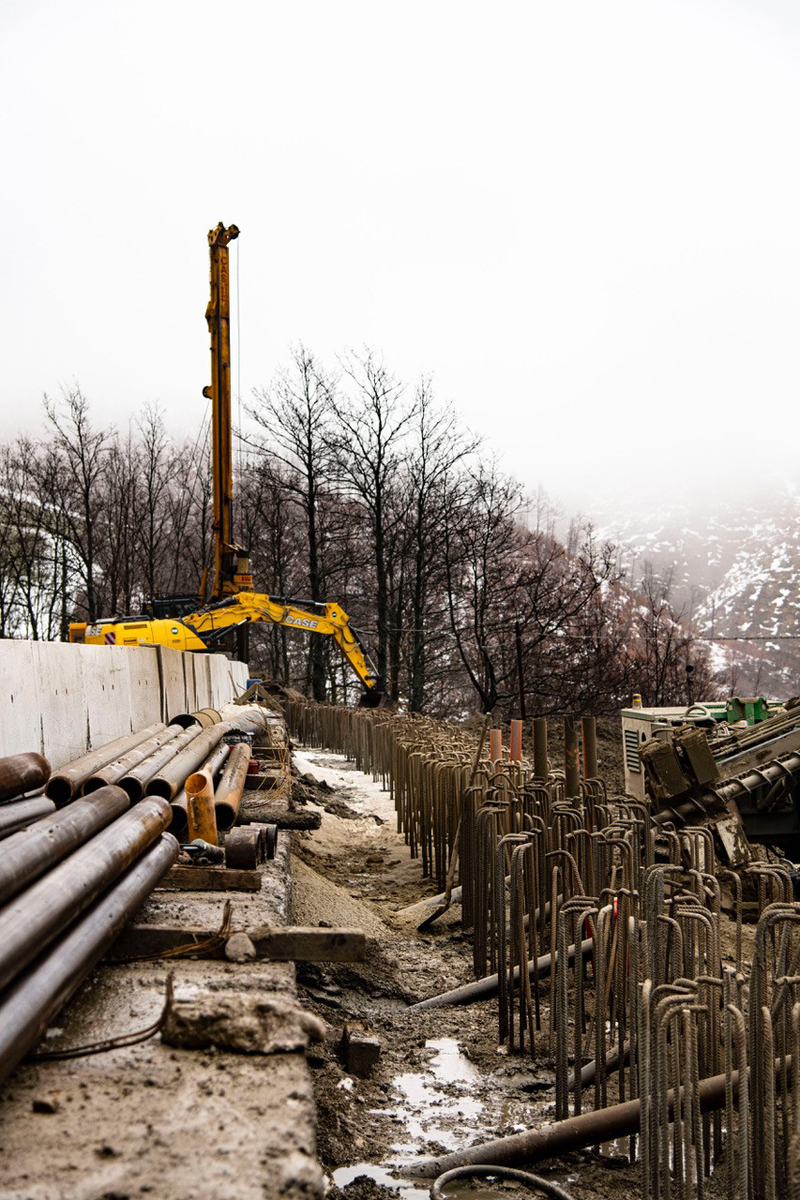 Zu den laufenden Arbeiten an der Spitze des Bocca Trabaria-Passes gehört das Stapeln von großkalibrigen Pfählen. Bis zu120 Pfähle mit einer Länge von 20 Metern und einer Breite von 80 Zentimetern müssen dabei bewegt werden. Nachdem die Rumpfspanten gesetzt wurden, werden die passiven Zugstangen (insgesamt ca. 100) im Inneren des Berges mit einer Neigung von 20 Grad zur Achse des Randsteins angebracht. Danach wird das Projekt mit einer Stützmauer und der neuen Barriere abgeschlossen, um die Straße zukunftssicher zu machen.