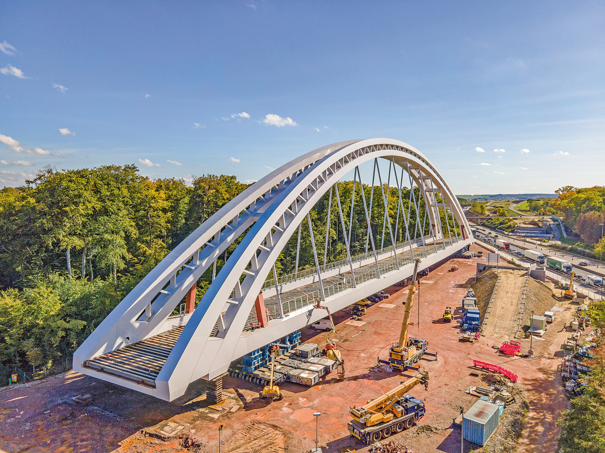 Seit 2020 fügten Spezialfachkräfte die Einzelteile der Zugbänder inklusive Fahrbahnplatte sowie der beiden Doppelbögen vor Ort zusammen. Daraus entstand die Bogenbrücke mit einem Gewicht von 5 850 t. »Sie ist eines von insgesamt acht Bauwerken, die im Rahmen der neuen Eisenbahnstrecke zwischen Luxemburg-Stadt und Bettemburg errichtet wird«, nennt Projektleiter Raimundo den ehrgeizigen Rahmen. »Das Projekt gehört zum ambitionierten Ausbau- und Modernisierungsprogramm der CFL. Neben der existierenden Strecke stellt diese zusätzliche Linie einen erheblichen Kapazitätsgewinn für diesen stark befahrenen Abschnitt des Luxemburgischen Schienennetzes dar.«