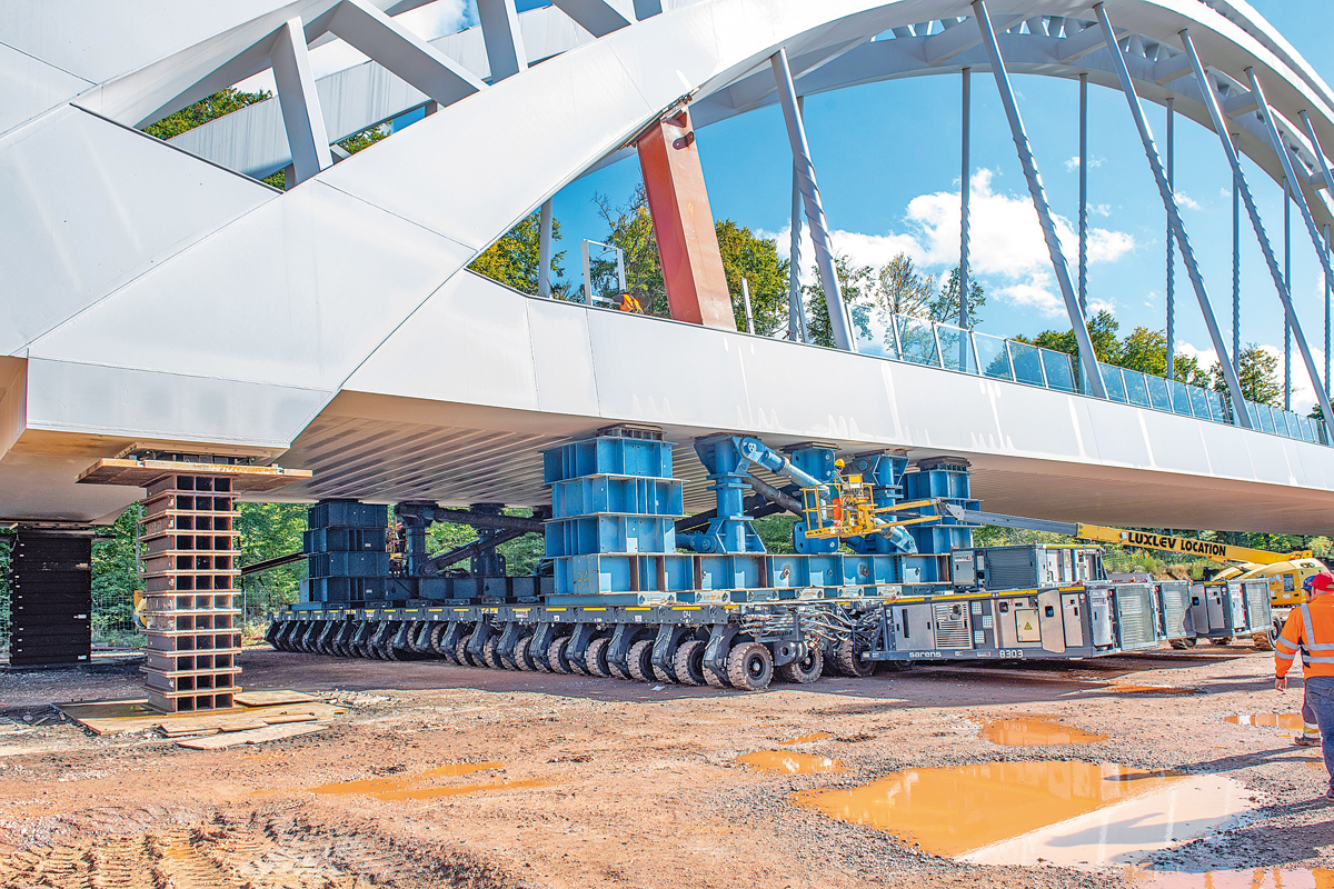 Durch den Einsatz hydraulischer Pressen wurde die Konstruktion im Vorfeld mittels »pack & jack«-Verfahren nach und nach auf eine Höhe von 5 m auf das Niveau der Brückenlager angehoben und ausgerichtet. Für die finale Fahrt kamen modulare Selbstfahrer zum Einsatz, die für solche Schwerlastaufgaben prädestiniert sind. Für die Durchführung der anspruchsvollen Transportaufgabe waren die weltweit aktiven Spezialisten der Firma Sarens zuständig. Sie hatten die Fahrzeugkombination im Vorfeld zusammengestellt und den Ablauf minutiös vorbereitet.