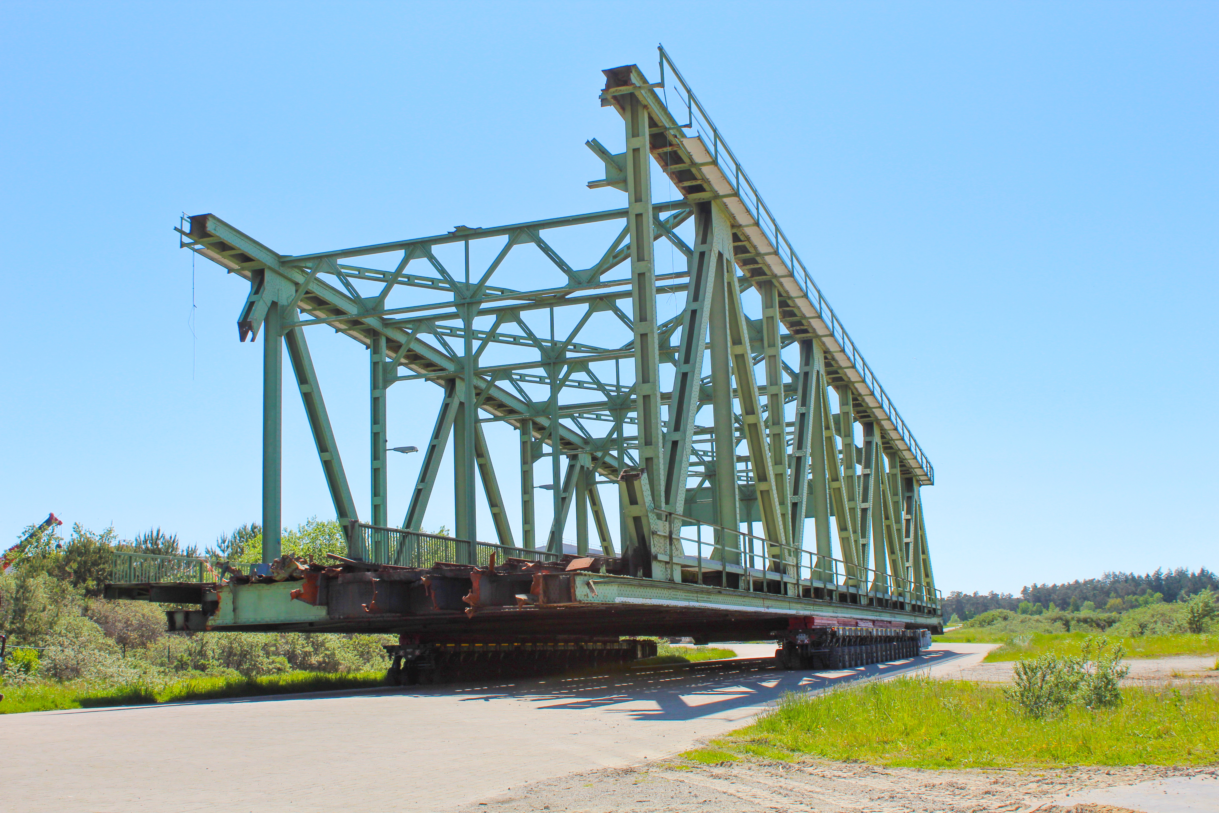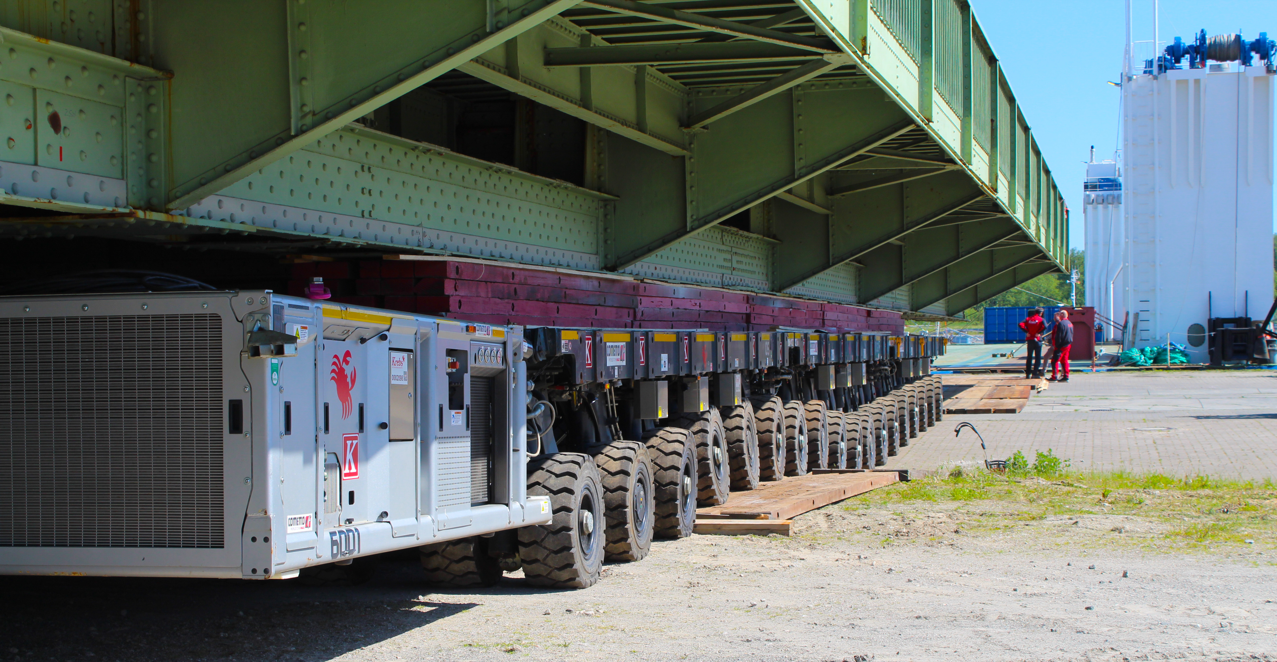 Über den Nord-Ostsee Kanal wird die Brücke auf einer Barge nach Lubmin geschleppt. Dort angekommen fährt das 1.000 Tonnen schwere Element mit 36 selbstangetriebenen modularen Achslinien Cometto SPMT und zwei Power-Pack-Einheiten mit einer Antriebskraft von je 202 kW von der Barge herunter.