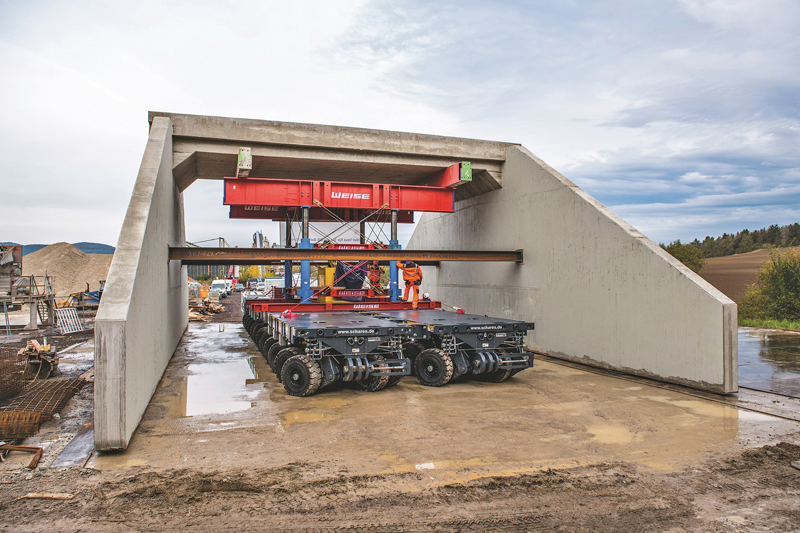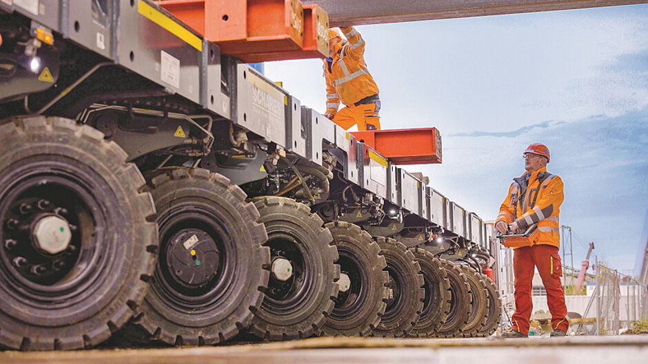 In den Tagen vor der Verschiebung hatte das Team von Autokrane Schares aus Bocholt, Essen, Goch und Willich eine Side-by-Side-Kombination von Cometto mit insgesamt 24 Achslinien zusammengebaut. Darauf ragte ein Hubgerüst, das für die Brückenaufnahme installiert wurde. Sechs Jahre arbeitet Markus Meckelholt bereits für Schares, bisher im klassischen Schwertransport. Doch mittlerweile hat ihn die Leidenschaft für die Selbstfahrerprojekte gepackt, die Tücken der anstehenden Aufgabe waren ihm deutlich bewusst: »Das leichte Gefälle muss ich stets mit dem SPMT ausgleichen. Daher mein Motto: ganz einfach schön langsam fahren und alles im Auge behalten.«