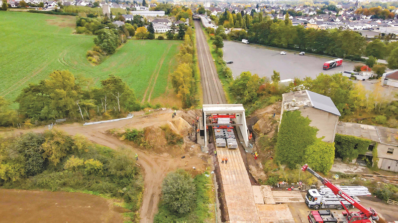 Die neue Bahnüberführung war innerhalb von sechs Monaten vor Ort fertiggestellt worden und sollte nun in die noch klaffende Lücke eingefahren werden, um künftig eine Straßenverbindung über die Bahntrasse zu schaffen.