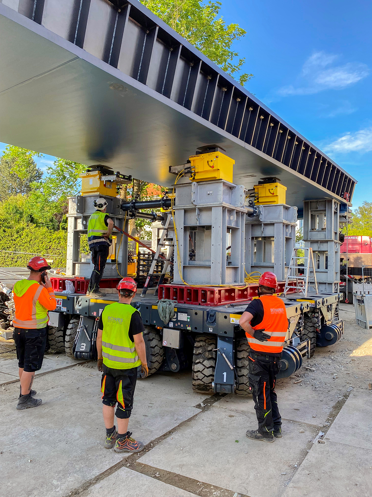 Im niedersächsischen Oldenburg sind die Schwergutspezialisten von Schares zusammengekommen, um mit einer 4-Achs SPMT-Kombination im side-by-side-Verbund eine 160 Tonnen schwere Eisenbahnbrücke zu transportieren.