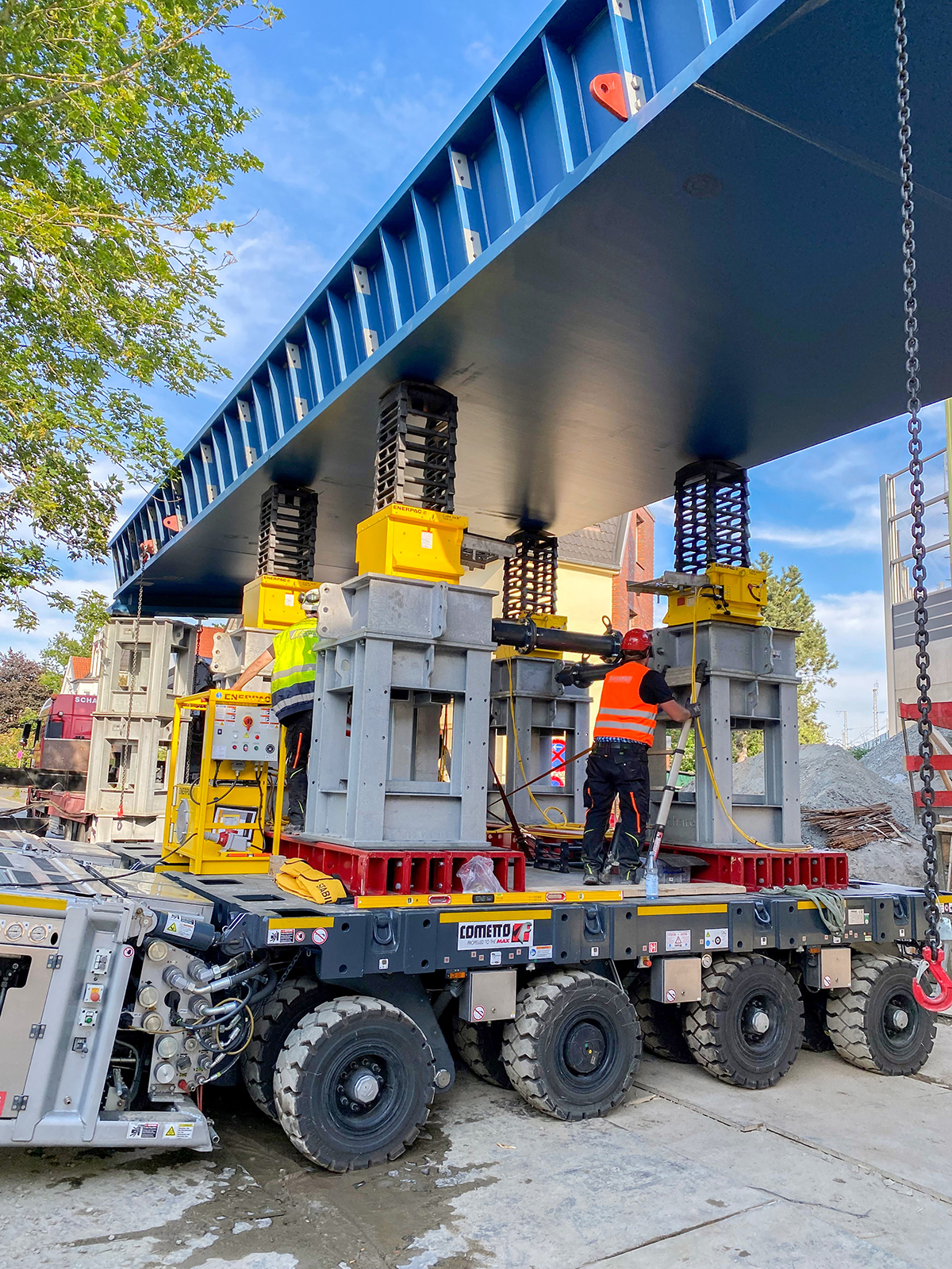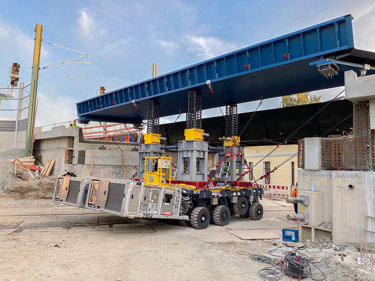 "Mit der elektronischen Lenkung dieser Fahrzeuge lässt sich so ein Bauwerk auf den Millimeter positionieren", berichtet Joachim Kolb, Sales Manager von Cometto, über die eingesetzte Technologie bei solcher einer Präzisionsaufgabe. "Das machet der Fahrer mühelos und super exakt über die Fernbedienung."
