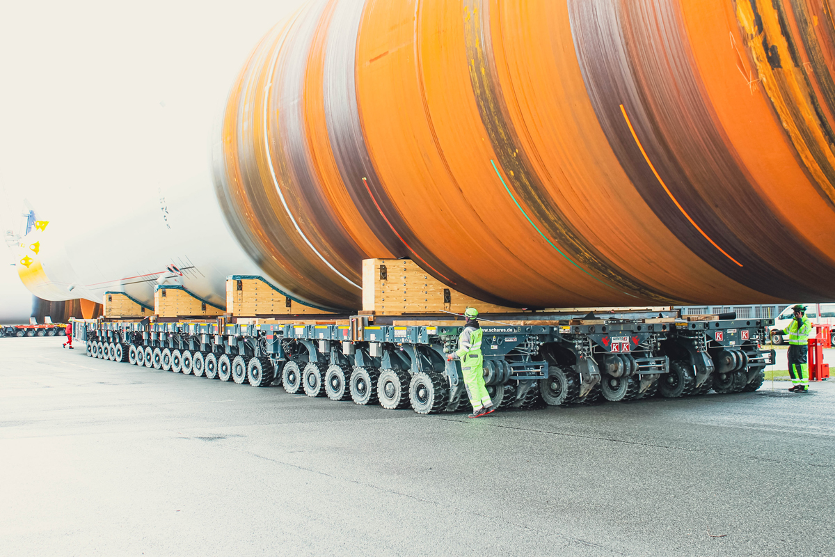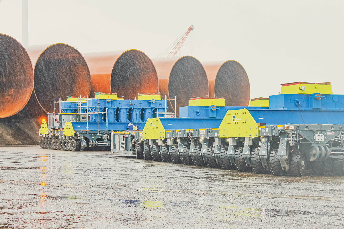 Für die beiden genannten Projekte lässt Ørsted Wind Power, dänischer Anbieter erneuerbarer Energien, bei verschiedenen Herstellern in unterschiedlichen Ländern die dazugehörigen Bauteile produzieren. »Die Monopiles kommen beispielsweise von Steelwind aus Nordenham in Norddeutschland, wo der Load-out mithilfe von 72 Cometto-Achslinien SPMT und drei Power-Pack-Units mit einer Leistung von je 368 kW durchgeführt wird«, nennt Joachim Kolb, Sales Manager bei Cometto, einen Einsatzort der Selbstfahrertechnologie von Cometto.