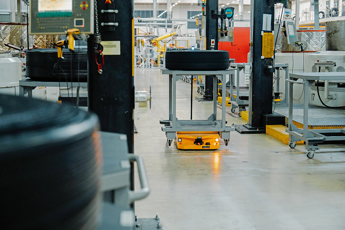 Die Roboter navigieren mithilfe moderner Sensorik, 360°-Kamerasystemen und KI-basierter Steuerung eigenständig und sicher durch die Produktionshalle. Mit maximalen Geschwindigkeiten von ca. 2 m pro Sekunde – das entspricht sehr schnellem Gehen – transportieren sie Reifen zwischen den einzelnen Stationen des Runderneuerungsprozesses: von der Reifenbaumaschine über die Heizpressen bis hin zur Qualitätskontrolle.