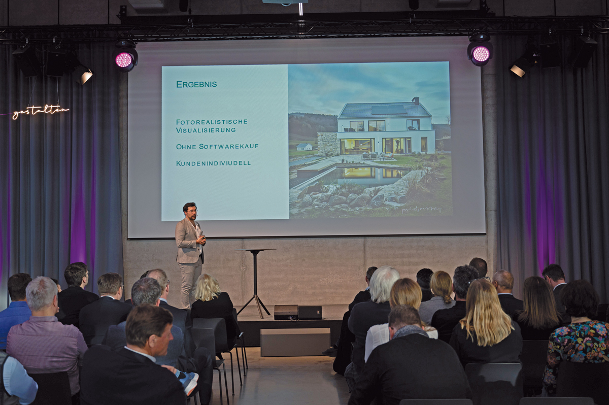 Bereits am Anfang seines Vortrags wies Dominik Steuer darauf hin, dass sämtliche Konzeptzeichnungen, Moodboards und Häuser in seiner Präsentation KI-generiert sind. Zur Herstellung der fotorealistischen Bilder wurden zunächst mit der Software ChatGPT die Anforderungen formuliert und anschließend mit Midjourney visualisiert. Auch wenn der eine oder andere Winkel nicht perfekt passte oder ein Statiker beim Betrachten graue Haare bekommt, überzeugte vor allem der hohe Detailreichtum. Passend zu den Objekten an sich wurden auch dazugehörige Elemente – wie Geschirr in der Küche, ein Sofa mit Polstern im Wohnbereich oder Liegen neben dem Pool im Außenbereich – generiert.