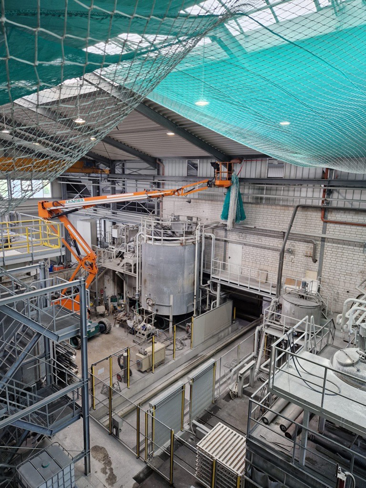 Aufgrund des geringen Platzangebots in der Halle war es nicht möglich, um zu fahren oder zu wenden, sodass die Netzer ihre Arbeiten von einer Position aus durchführen mussten. Hierfür wurde die volle Reichweite der Bühne von 18,90 m benötigt. So konnte die herausfordernde Aufgabe gemeistert und ein sicheres Arbeitsumfeld für die Stahlbauer geschaffen werden.