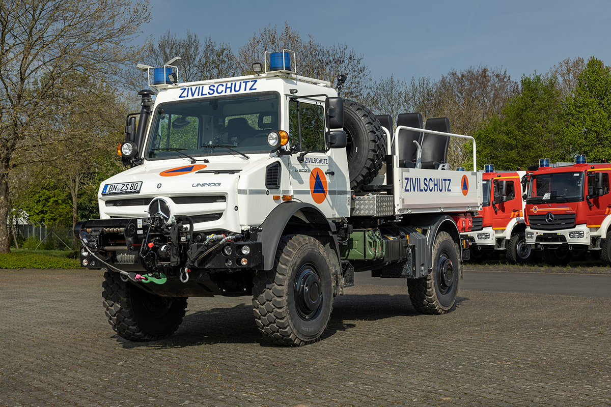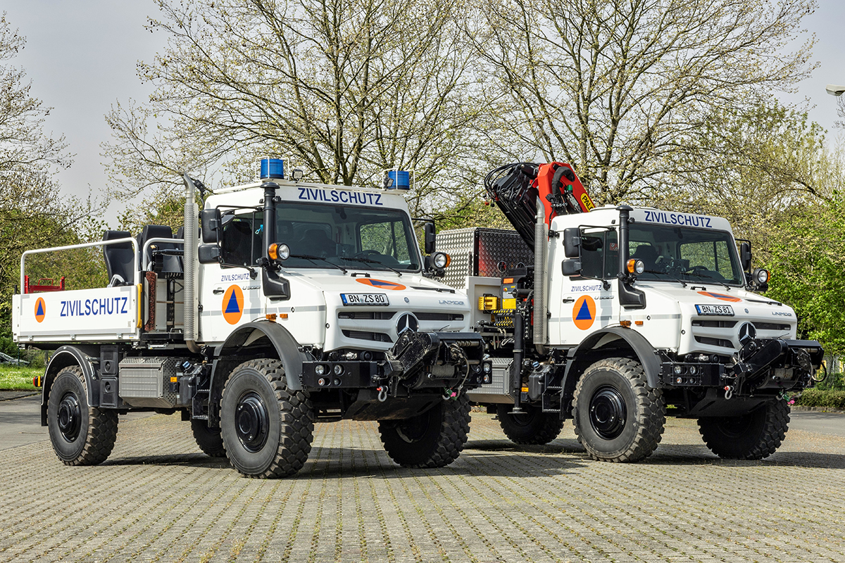 Einer der beiden baugleichen Unimog U 5023 ist der neu konzipierte Typ eines multifunktionalen Zivilschutzfahrzeugs mit einem Wechselpritschen-Aufbau, der mit vier Twistlock-Verschlüssen am Rahmen befestigt wird. Auf dem Rahmen können je nach Anwendungsfall unterschiedliche Wechselaufbauten schnell befestigt werden, um auch bei schwierigen Straßen- und Geländeverhältnissen eine reibungslose Logistik in betroffenen Gebieten zu ermöglichen. In der Erprobungsphase kommen beispielsweise kompakte 10-Fuß-Container und eine Pritsche zur Beförderung von Einsatztrupps oder geretteten Personen zum Einsatz. Getestet wird auch der Einsatz mit Containern auf einem Zentralachs- bzw. Tandem-Anhänger.