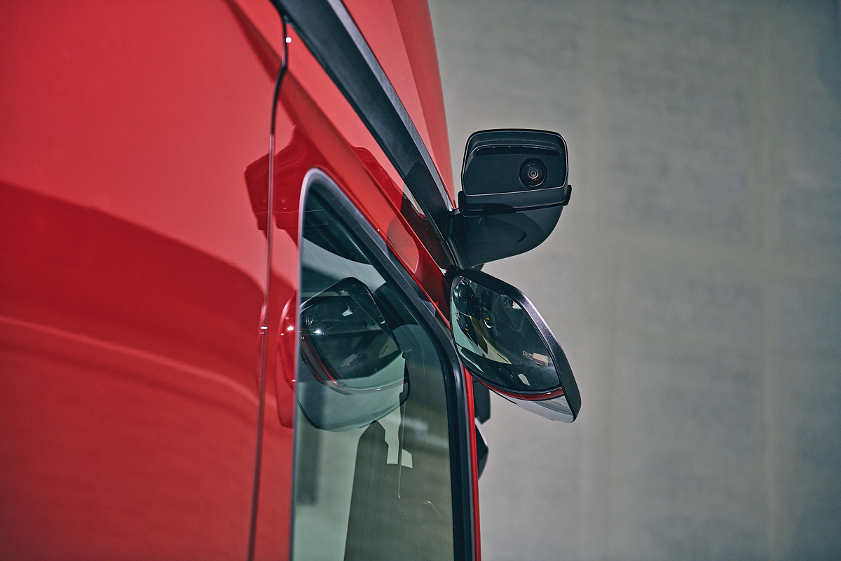 Weil es auf Baustellen oft eng zugeht, soll sich hier neben allen in den Lkw von Mercedes-Benz Trucks verbauten Sicherheitssystemen ein Feature besonders bezahlt machen: die MirrorCam, die anstelle der herkömmlichen Haupt- und Weitwinkelspiegel in den Actros- und Arocs-Lkw für den Verteilerverkehr optional und im eActros serienmäßig verbaut ist. Zum Einsatz kommt dabei seit April die zweite Generation des Spiegelkamerasystems, das den Fahrer u. a. durch 10 cm kürzere Kameraarme pro Seite und neue Bildparameter in vielen Situationen im Straßenverkehr nun noch besser unterstützen kann. Dank der Verkürzung der Kameraarme soll sich der Fahrer beim geradeaus Rückwärtsfahren gegenüber der ersten Generation deutlich leichter tun. Das liegt nach Herstellerangaben insbesondere daran, dass die Perspektive der MirrorCam nun der des gewohnten Glasspiegels noch ähnlicher ist, was wiederum die Umgewöhnung vom Spiegel auf die MirrorCam erleichtern soll. Auch Kollisionen mit Objekten am Wegesrand sollen damit meist vermieden werden.