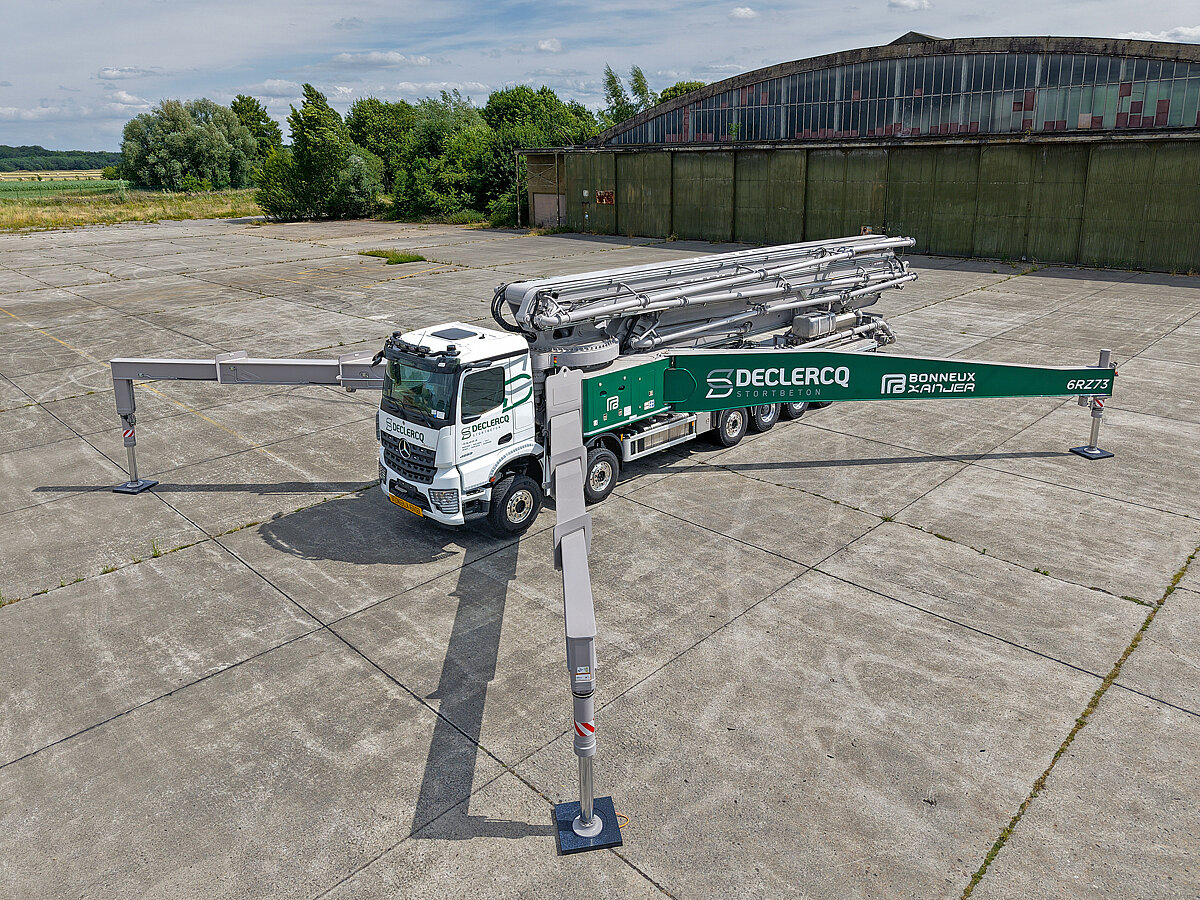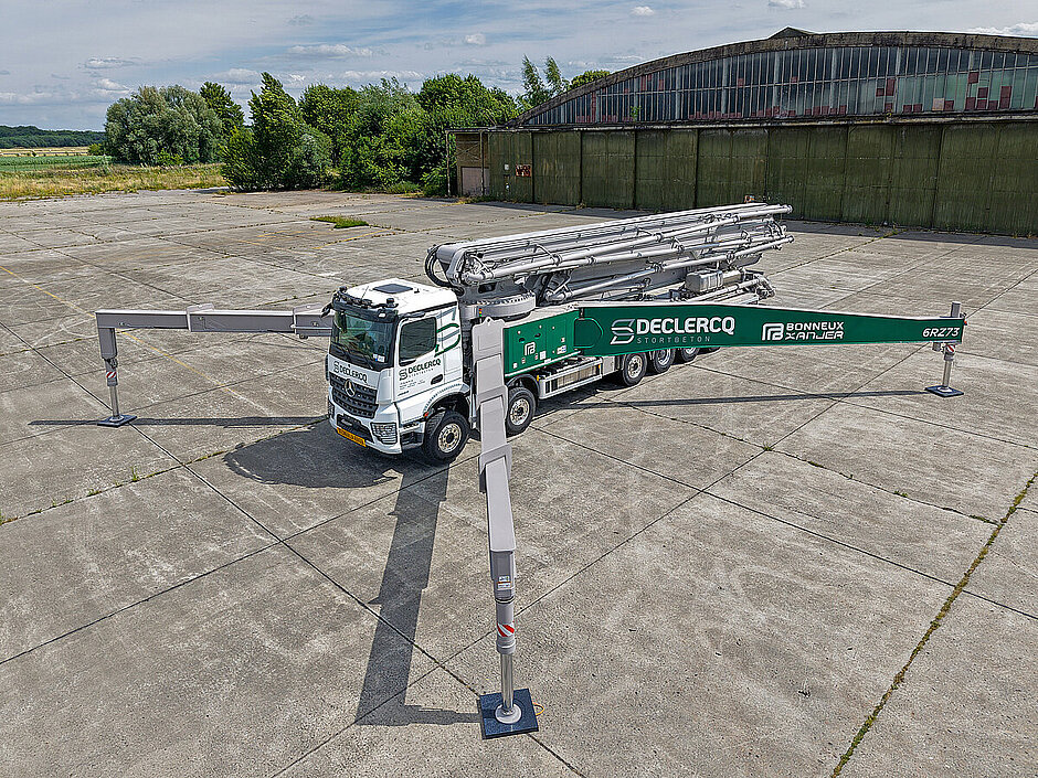 Mit einem Gesamtgewicht von 66 t und einer Länge von 18 m ist diese Kombination für anspruchsvolle und komplexe Bauprojekte ausgelegt. Der sechsarmige Ausleger der »6RZ73« entfaltet sich wie ein stählernes Spinnennetz und ermöglicht präzises Arbeiten selbst auf engstem Raum. Mit ihrer enormen Reichweite bringt sie Beton selbst dort hin, wo andere Systeme längst an ihre Grenzen stoßen. Aufgrund intelligenter Schwingungsdämpfung, bionisch verstärkten Designs und modernster computergestützter Analyse bleibt die Pumpe auch unter extremen Bedingungen stabil und effizient. Die Steuerung erfolgt drahtlos über eine Funkfernsteuerung, die dem Maschinenführer hohe Präzision und Sicherheit bietet.