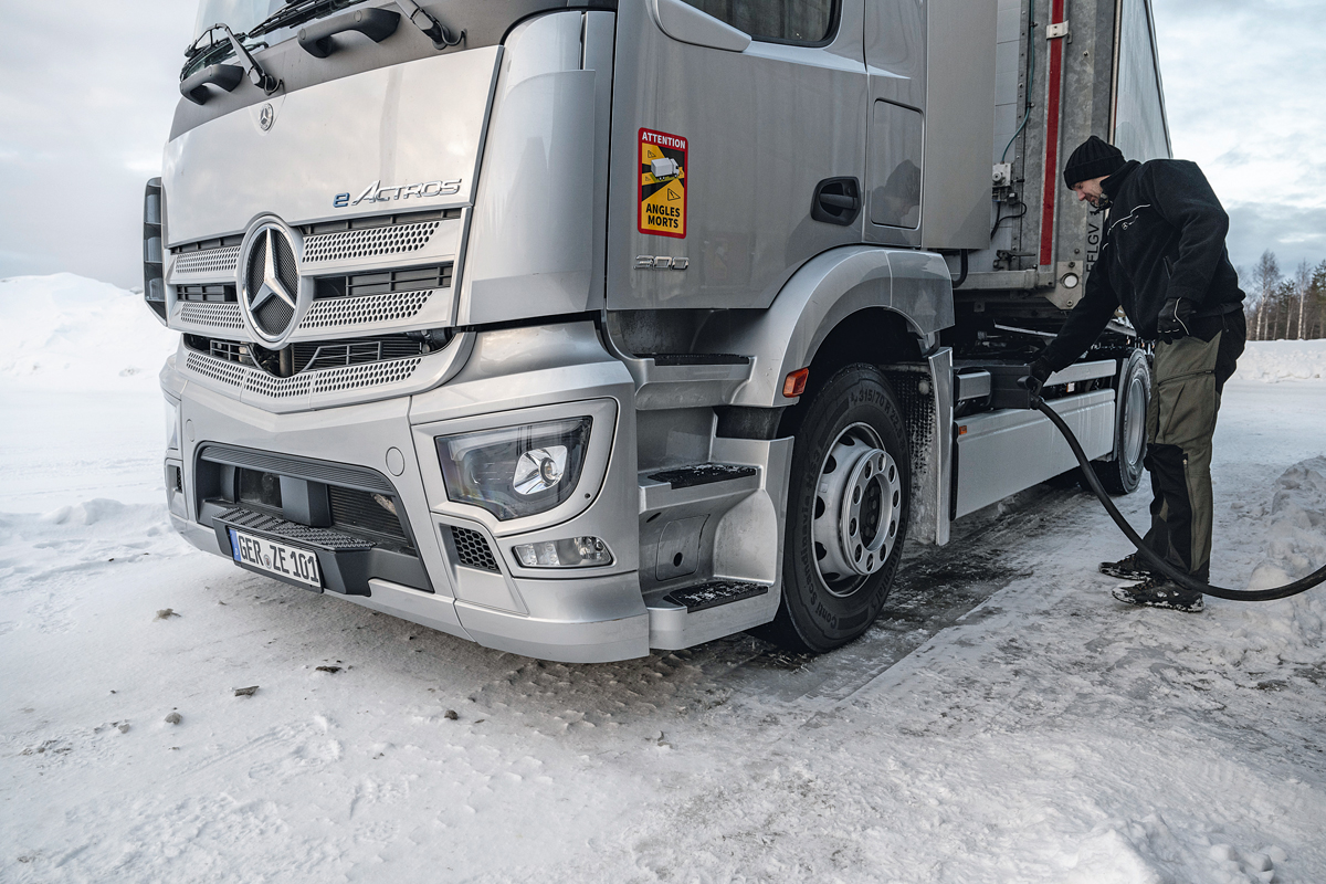 Hierbei zeigte sich zum Beispiel, dass der eActros LongHaul durch seinen kleineren Heizkreis mit großer Leistung das Fahrerhaus grundsätzlich schneller erwärmt als ein Diesel-Lkw. Da die Energie hierfür aber den im Fahrzeug verbauten Batterien entnommen wird und sich so die Reichweite reduziert, empfiehlt sich das sogenannte Pre-Conditioning beziehungsweise energieeffiziente Vorklimatisieren des E-Lkw an einer Ladesäule. Nach dem Pre-Conditioning büßt der eActros LongHaul auch bei extremer Kälte weniger an Reichweite ein. »Wir sind sehr zufrieden mit unseren Testergebnissen. Denn die Prüfungen etwa des Verhaltens der Batterien und des elektrischen Antriebsstrangs bei extremen Temperaturen oder auch des Fahrverhaltens der Fahrzeuge auf spiegelglatten Straßen zeigen: Selbst bei sehr winterlichen Verhältnissen sind unsere batterieelektrischen Lkw voll einsatzbereit«, so Christof Weber.