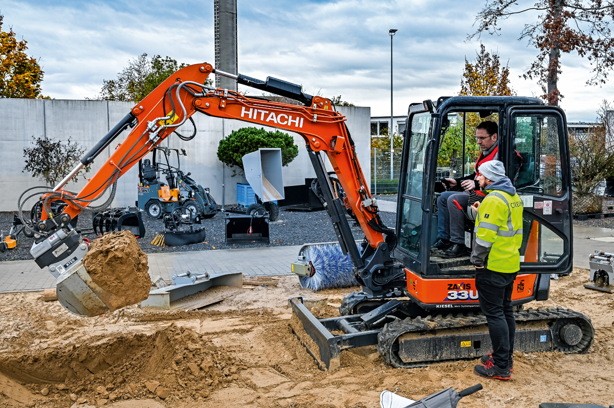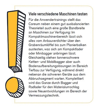 Die erfahrenen Akademie-Trainer Markus Stegmüller und Thorsten Merz-Mantwill hatten im Vorfeld ein Trainingsprogramm ausgearbeitet, das sowohl dem unerfahrenen Nachwuchs als auch alteingesessenen »Baggerhasen« gerecht wurde. »Das offene Training zielt darauf ab, ein individuell zugeschnittenes Programm zu bieten«, so Markus Stegmüller, der das in erster Linie von den Erfahrungswerten seiner Teilnehmer abhängig macht. »Gleichzeitig hat das Training zum Zie, den Umgang mit der Maschine weiter zu verbessern, neue Systeme kennenzulernen und sich fit für die Zukunft zu machen«, ergänzte Thorsten Merz-Mantwill, der in diesem Zusammenhang auch auf Trainings für Technikliebhaber aufmerksam machte. Die Coreum-Akademie bietet abseits der Anwendertrainings auch Technik-Varianten an, die auf Antriebe, Elektrik, Motoren und Hydraulik abzielen, um die vorhandenen Diagnose- und Wartungsfähigkeiten weiter zu schärfen. »Der große Vorteil im Coreum ist der direkte Draht zur Praxis: Bloße Theorie findet bei uns nicht statt – sie ist gezielt anwendernah integriert und sorgt dafür, dass ein guter Mix entsteht«, sagte Markus Stegmüller, was er am ersten Tag unseres Trainings auch prompt unter Beweis stellte.