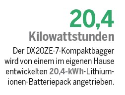 Der DX20ZE-7-Kompaktbagger wird von einem im eigenen Hause entwickelten 20,4-kWh-Lithiumionen-Batteriepack angetrieben, während die gesamte Elektroanlage und alle Komponenten der Maschine für die Arbeit in rauen Umgebungen optimiert sind. Mit einem Schnellladesystem können innerhalb von einer Stunde und 20 Minuten 80 % der Batterieleistung wiederhergestellt werden. Nach acht Stunden Aufladung mit dem Bordladegerät wird der maximale Ladungswert der Batterie wieder erreicht.d