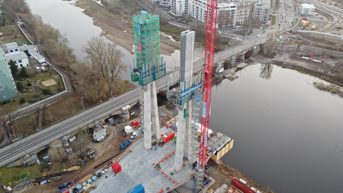 Im Ergebnis wurden mit diesem System sowohl die Pylongeometrie aufgenommen, die Bauwerksneigung eingehalten und kranunabhängiges Klettern ohne Umbau der Klettereinheiten erreicht sowie dank der kompletten Einhausung sicheres Arbeiten in allen Bereichen ermöglicht. »Im Ergebnis konnten wir die Pylone in Massivbauweise in Rekordzeit erstellen. Denn obwohl der Aufbau der Kletterschalung erst anderthalb Monate später gestartet werden konnte als ursprünglich vorgesehen, wurden die Pylone zum festgeschriebenen Zeitpunkt an den Stahlbauer übergeben. Das war bei der Schwierigkeit des Projekts, mit den in zwei Richtungen geneigten Pylonen, die im Bauzustand nicht symmetrisch vorgekrümmt gebaut werden, nicht selbstverständlich«, fügt Bauleiter Paul Schmidt hinzu.