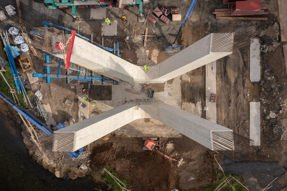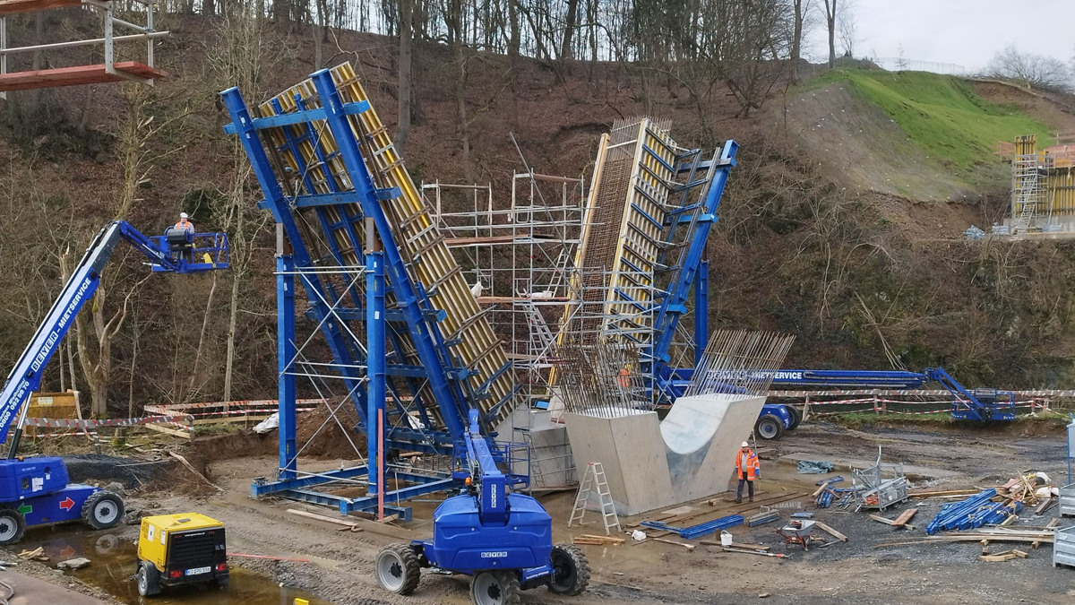 Mit ihren knapp 122 m Länge zählt die neue Nisterbrücke zu den eher mittelgroßen Infrastrukturprojekten von Doka. Doch die Größe sagt nicht immer etwas über den Schwierigkeitsgrad aus, wie Niederlassungsleiter Denis Müller von Gross Bau bestätigt: „Der Brücke hat zwar nur einen Brückenpfeiler, doch dessen Geometrie ist nicht ohne, mit einigen kniffligen Besonderheiten. Umso mehr muss man anerkennen: Der Vorschlag von Doka war aus unserer Sicht ein Volltreffer, denn deren Techniker haben sich wirklich Gedanken gemacht, wie unsere Baustellenmannschaft am besten mit der Schalungskonstruktion zurechtkommt und wie wir gleichzeitig möglichst effizient vorankommen.“