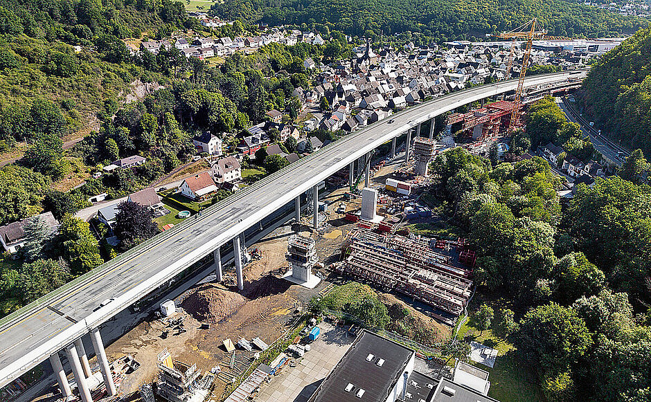 Wie so viele Autobahnbrücken in Deutschland weist auch die Talbrücke Sechshelden an der A 45 zwischen Dillenburg und Haiger erhebliche altersbedingte Abnutzungen auf und muss ersetzt werden. Die alte Brücke soll im Zuge dessen bei laufendem Verkehr abgerissen und neu gebaut werden. Ein Projekt mit zahlreichen Herausforderungen. Eine davon ist seine Lage: Das Baufeld liegt dicht am Ortsrand von Sechshelden, teils in steiler Hanglage und eingerahmt von einer Bahnlinie, dem Fluss Dill und einer Bundesstraße – was Arbeiten unter äußerst beengten Platzverhältnissen bedeutet.