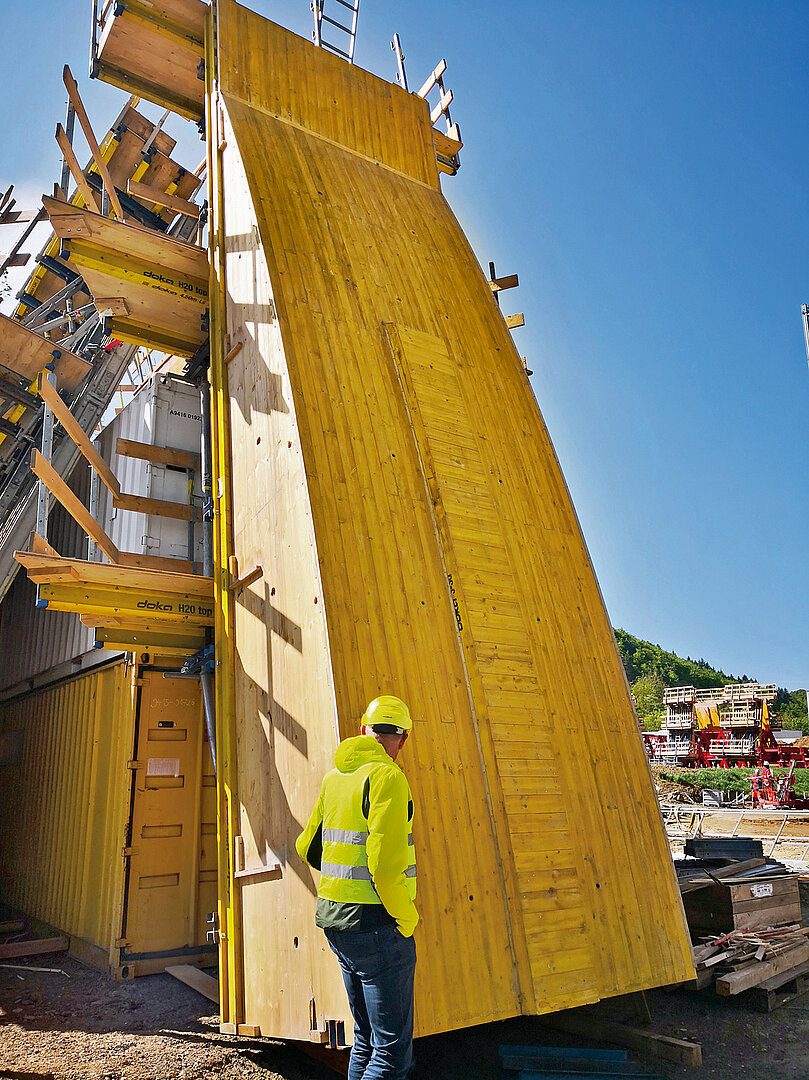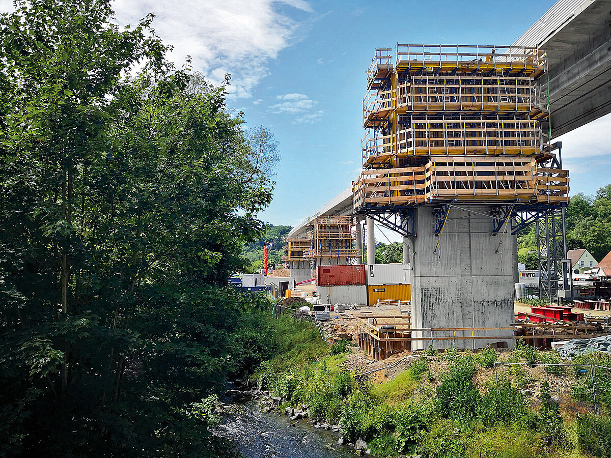 Mit Fundamenten, Widerlagern, Stützwänden und Pfeilern war Doka für sämtliche tragenden Bauteile der Talbrücke Sechshelden verantwortlich und deckte von technischer Planung und Statik über Systembereitstellung bis zu Fertigservice und Schalungsvormontage nahezu die gesamte Dienstleistungspalette ab. Wechselnde Gründungsebenen und Hanglage bestimmten die Anforderungen an die Fundamente. Diese wurden mit »Framax Xlife« hergestellt, für die sicheren Zugänge zu den Arbeitsebenen kamen Grabenbrücken aus Dokas Modulgerüst »Ringlock« zum Einsatz. Auch bei den Widerlagern war eine genaue, sichere Planung wichtig: zum einen aufgrund der teilweise sehr geringen Abstände zu Bestand und Straße, auf der der Verkehr weiter fließen musste; zum anderen wegen der Höhen von bis zu 12 m mit anschließenden hohen Stützwänden. Systemseitig setzte man auf die Trägerschalung »FF20« mit »Top 50«-Komponenten, um die gewünschte Brettstruktur in Sichtbeton (SB 2) zu erzielen. Anzahl und Anspruch machten die Pfeiler gleich in doppelter insicht zum Prüfstein des gesamten Unterbaus: 14 Vollpfeiler je Fahrtrichtung, mit 8 m hohen, muschelartig aufgeweitetem Kopf. Geschalt wurde hier wiederum mit »FF20«- und »Top 50«-Komponenten sowie der Sperrenschalung »D22« unter Einsatz der A-Bock-Bühnen. Gerade die bewährte sich auf der engen Baustelle, indem sie sicheres Arbeiten mit deutlich reduziertem Bühnenaufwand ermöglichte.