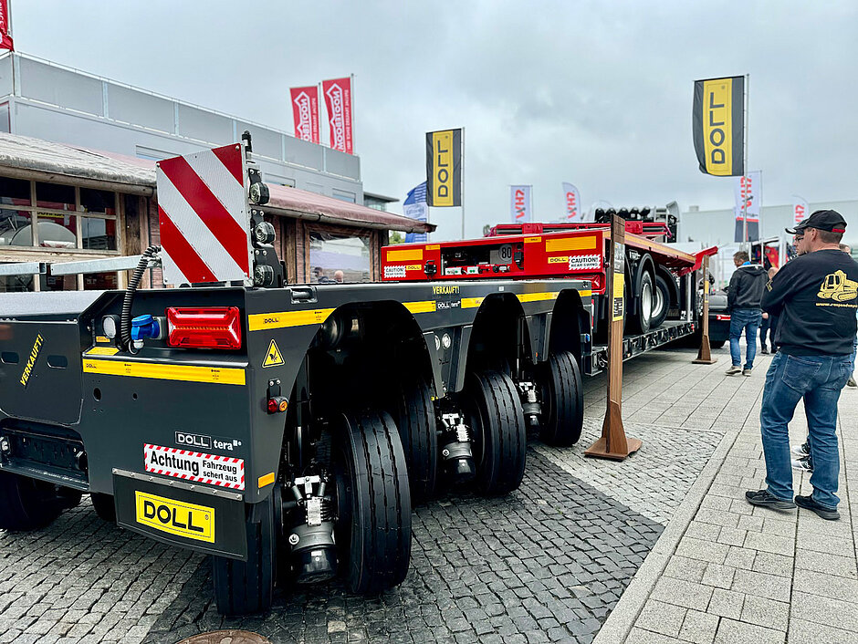 Steile Baustelleneinfahrten und unbefestigte Straßen mit Schlaglöchern stellen beim Transport von schweren und großen Maschinen oder Bauteilen besondere Herausforderungen dar. Das auf der IAA gezeigte Tiefbett mit der Pendelachse Doll tera wurde speziell für diese Anforderungen entwickelt. Mit einem Hub von 600 mm gibt die tera-Achse dem Fahrzeug ausreichend Bodenfreiheit für Schwertransporte in unwegsamem Gelände. Der Fahrer kann die Achsen bei Unebenheiten und Höhenunterschieden entsprechend hochfahren. Gleichzeitig ermöglicht die Pendelachse, die Ladehöhe individuell auf das Ladegut anzupassen. Bei einem Ladegut von bis zu 3.700 mm Höhe wird auf diese Weise die gesetzliche Gesamthöhe nicht überschritten. Für den Transport großer Baumaschinen bietet die tera-Achse einen weiteren Vorteil: Das Hinterachsfahrwerk bietet Platz für eine durchgehende Baggermulde mit einer Breite von 700 mm. Hier kann der Baggerarm des Baggers durchgängig abgelegt werden. Mit einem maximalen Lenkeinschlag von 60 Grad bleibt das Fahrzeug auch im Gelände oder auf engem Raum sehr gut manövrierbar. Die robuste tera-Pendelachse wird bereits seit über 25 Jahren für Militärfahrzeuge genutzt und hat sich dort im Off-Road-Einsatz bewährt. Seit kurzem vertreibt DOLL die tera-Fahrwerkstechnologie auch an zivile Kunden. Mit großem Erfolg: „Seit der Markteinführung im Herbst 2022 ist die Nachfrage nach unserer robustesten Achse im zivilen Bereich konstant hoch“, berichtet Mathias Neumayer, Produktmanager Schwerlasttransport bei Doll. „Es sind bereits Dutzende Fahrzeuge bei unseren Kunden im Einsatz.“ Für den Transport besonders breiter Baumaschinen ist das DOLL 3-Achs-Tiefbett auch in einer Fahrzeugbreite von 2.750 mm lieferbar.