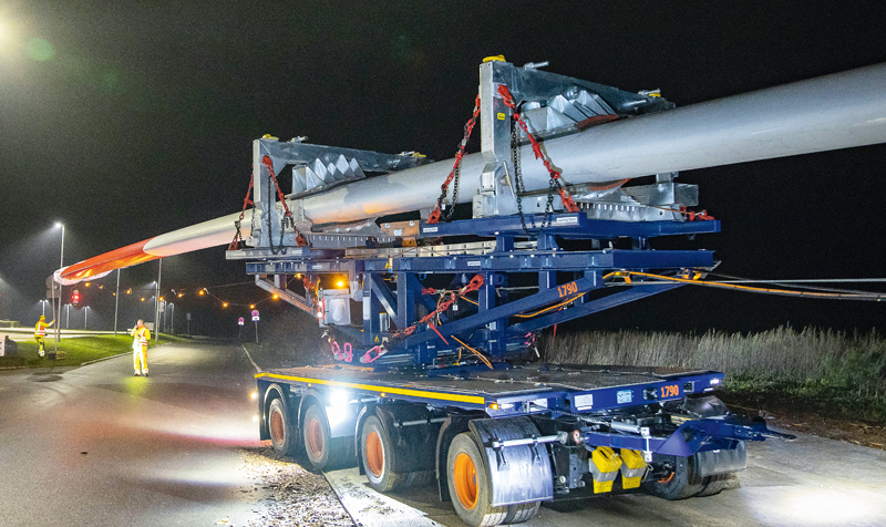 Die neuen Kombinationen hätten sich durchweg bewährt, bestätigt auch Holger Dechant, Geschäftsführer von Universal Transport. »Wir müssen nunmal auf die immer längeren Rotorblätter reagieren.« Er spricht dabei ein Thema an, das rund um die Windenergie den gesamten Transportsektor bewegt. »Die Parameter in der Windkraftbranche verschieben sich ständig, sowohl seitens der Politik als auch seitens der Anlagenhersteller. Wir haben somit einerseits sehr große Schwankungen beim Transportaufkommen, andererseits ständig neue Herausforderungen bei den Abmessungen. Allen voran bei den Rotorblättern, aber natürlich auch bei den Türmen und Maschinenhäusern. Mit dem klassischen Telesattel kommt man da nicht mehr weit. Das Equipment wird immer spezieller und, da verrate ich auch kein Geheimnis, immer kostenintensiver.«