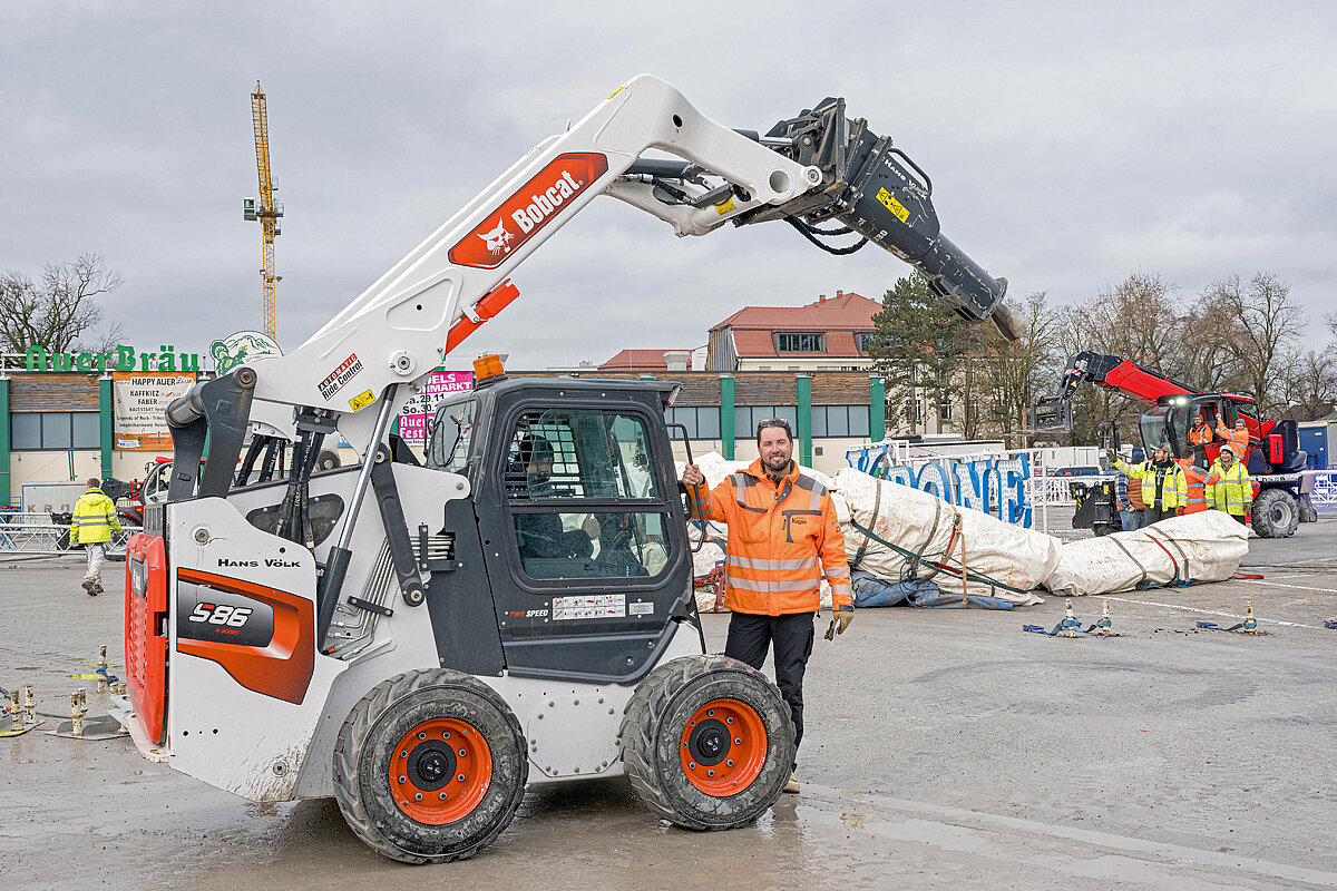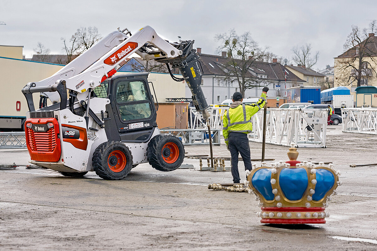 Die Technikverantwortlichen von Circus Krone diskutierten gemeinsam mit dem Bobcat-Händler Hans Völk die Situation und fanden schließlich die passende Maschine: den Bobcat-Kompaktlader des Typs »S86«, das im Übrigen derzeit stärkste Modell seiner Klasse. Die Kombination aus enormer Hydraulikleistung und kompakter Bauweise war der Schlüssel: Beim Aufbau eines riesigen Zirkuszelts kommt es nicht nur auf pure Kraft, sondern auch auf Präzision, Schnelligkeit und Zuverlässigkeit an. Genau das ermöglicht der »S86«. Zwei leistungsstarke Hydrauliksysteme – Standard Flow und Super Flow – liefern bis zu 159 l/min. und damit genug Power, um selbst schwerste Anbaugeräte wie den speziell angefertigten Hydraulikhammer souverän zu betreiben. »Der ›S86‹ hat die leistungsfähigste High-Flow-Hydraulik, die Bobcat je in einen Kompaktlader eingebaut hat. Genau das, was Circus Krone braucht«, erklärt Harald Sancu, Bereichsleiter Gewerbetechnik bei Hans Völk. »Unsere Herausforderung war es, eine Maschine bereitzustellen, die mit dieser Power umgehen kann und gleichzeitig die Eisenanker millimetergenau einschlägt, ohne sie zu verbiegen.«